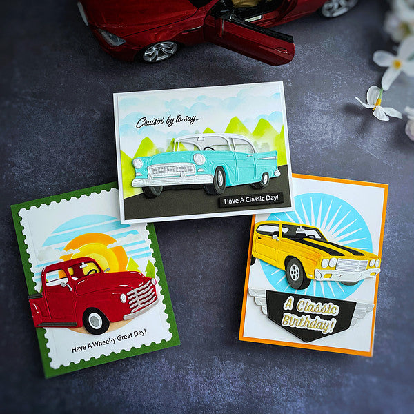 Classic Road Legends Car & Truck Die Bundle includes all the vehicles in the Classic Road Legends Collection by Mindy Eggen: S4-1443 Muscle Car, S4-1444 Classic Car and S4-1446 Timeless Truck. This bundle brings three iconic vehicles into your hands for endless creativity!