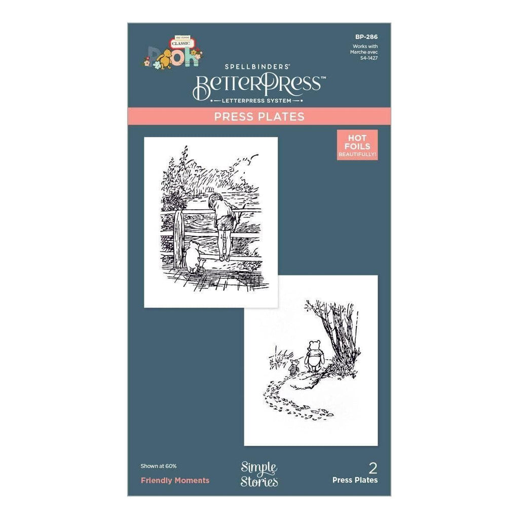 Friendly Moments Press Plate is part of the Say Cheese Classic Pooh Collection. This set of two press plates captures two different sweet scenes. The larger plate presses a bridge scene with Pooh and Christopher. The smaller plate shows Pooh and Piglet walking along a trail. Add a sentiment from BP-285 Silly Old Bear Sentiments Press Plate & Die Set to tie the scene perfectly! Also works well with the S4-1427 Memory Frames Etched Dies to anchor the ensemble. Ink the plates with the BetterPress Ink to be pressed against the BetterPress Cotton Card Panel and Sheets for a crisp letterpress design.