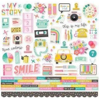 Simple Stories - True Colors Collection Kit includes 12 sheets of double-sided 12x12 Designer Cardstock which includes cut apart sheets, and a 12x12 Cardstock Sticker Sheet. Total of 107 pieces in this kit.