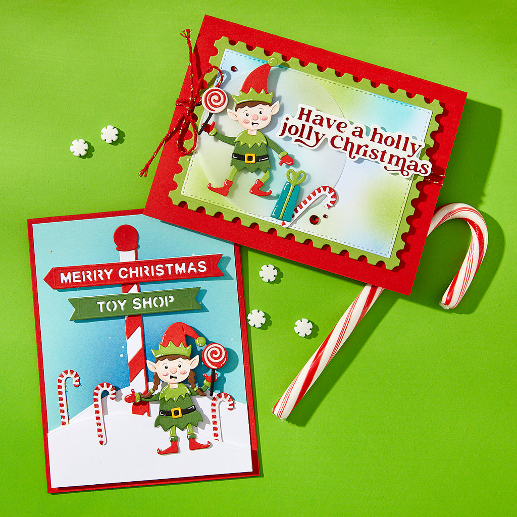 Santa's Elves Etched Dies are part of the North Pole Friends Collection by Simon Hurley. This fun set of 24 thin metal cutting dies creates adorable elves with all sorts of wonderful accessories. Cut a bunch and see what kind of trouble they get into with candies and presents! Dress them up with hats, outfits, mitts and boots. Lots of different design options!