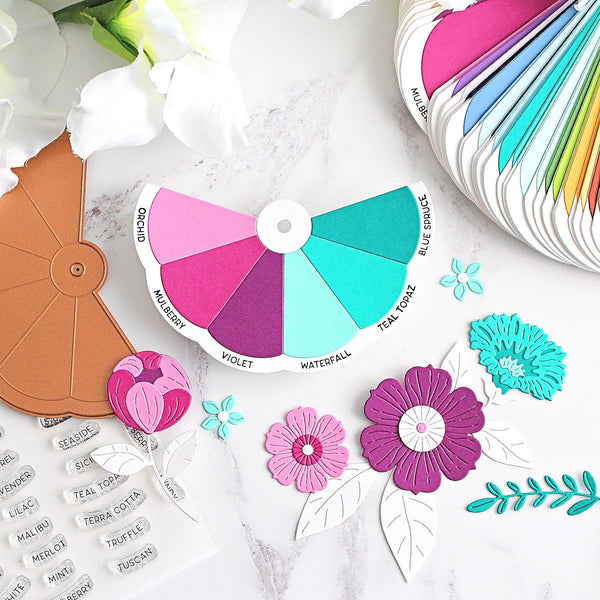 Create your own irresistible swatch deck of the new ColorWheel shades when you combine CSA-001 The Full 48 ColorWheel Cardstock Pack, and SCSE-014 Book Rings. Not only will your swatch deck be a helpful organizational tool and aneasy reference for your collection - it's also a beautiful addition to your crafting space!