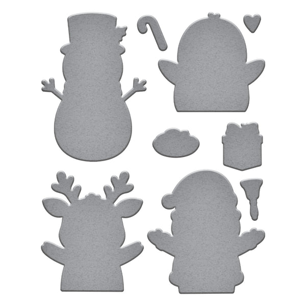 Christmas Hugs Stamp and Die Bundle includes S7-281 Christmas Hugs Etched Dies and HUR92278 Christmas Hugs Clear Stamp Set. Together, the bundle stamps and cuts fun seasonal friends like Santa, penguins, deer, and snowmen, along with items such as a gift, candy cane, bell and plate of cookies.