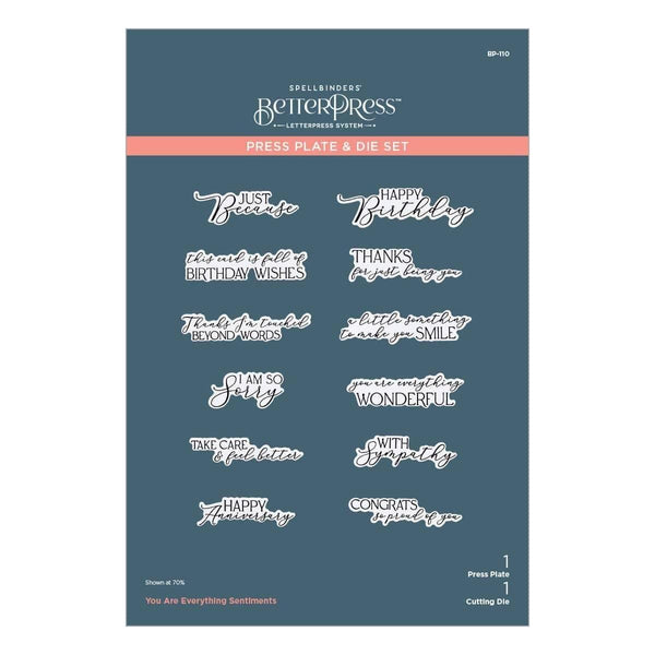 You are Everything Sentiments Press Plate & Die Set is from the Pressed Posies Collection. This one plate is filled with 12 all occasion sentiments that cover from Happy Anniversary, With Sympathy, Just Because, Thanks, Birthday Wishes and more! The corresponding thin metal cutting die cuts all the sentiments at the same time. What a time saver and a great addition to any cardmaker’s stash! Ink the plates with the BetterPress Ink to be pressed against the BetterPress Cotton Card Panel and Sheets for a crisp letterpress design.
