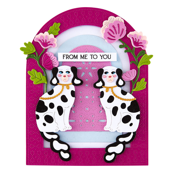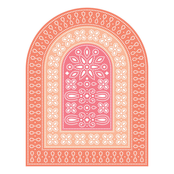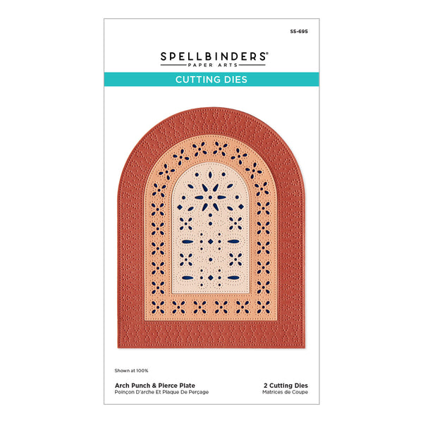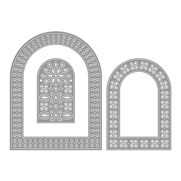 Create stunning textured backgrounds with Arch Punch & Pierce Plate Etched Dies. This set of two thin metal dies cuts out a classic arch shape that fills an A2 size card front, with a gorgeous insert to add intricate pierced details. The design features three nested arches, each filled with it's own pattern of dotted and looped pierced designs, perfect for a full sized background or smaller matting shapes. This set coordinates with S5-526 Essential Arches to cut out the inner shapes, or add more nesting arches for dimension!