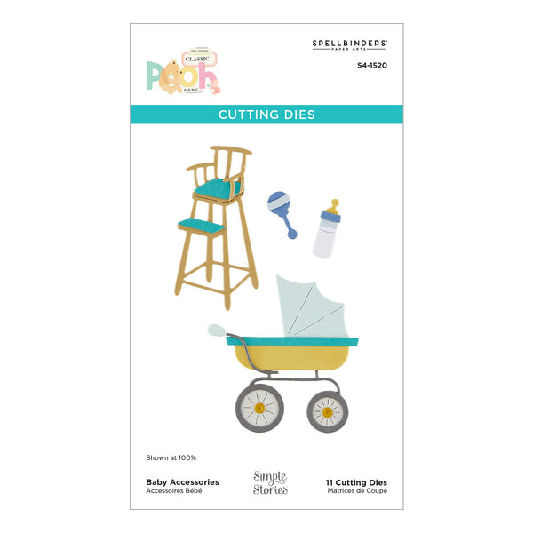 Baby Accessories Etched Dies are from the Say Cheese Classic Pooh Baby Collection with Simple Stories. This set of 11 thin metal cutting dies goes well with S4-1519 Kanga & Roo set to add more baby gear for Roo! It includes a sweet baby carriage, bottle, rattle and a detailed high chair. So fun to add as accents to any baby card, journal spot or scrapbook page.