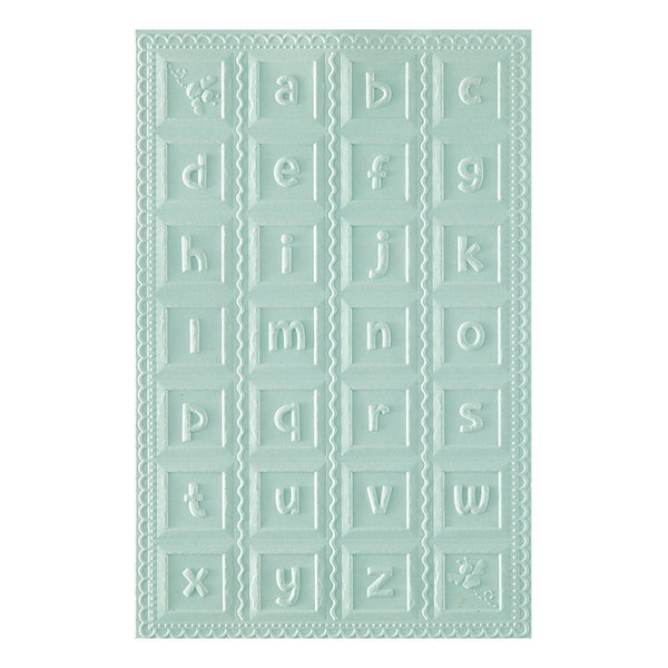 Classic Pooh Baby Blocks 3D Embossing Folder is a 5.50 x 8.50-inch embossing folder with a wonderful background filled with lower case alpha blocks and two buzzing bee blocks framed in a sweet loop design. For interest, punch out the blocks with T-081 1-inch Square Punch (sold separately) and pop them up with foam squares or use individually.