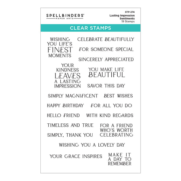 Lasting Impressions Sentiments Clear Stamps is part of the Regal Reflections Collection with 19 clear stamps featuring phrases to celebrate life's finest moments. Perfect for card fronts or inside sentiments, this 4 x 6" stamp set includes messages like "Timeless and True," "Savor This Day," "Your Kindness Leaves a Lasting Impression" and more.