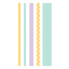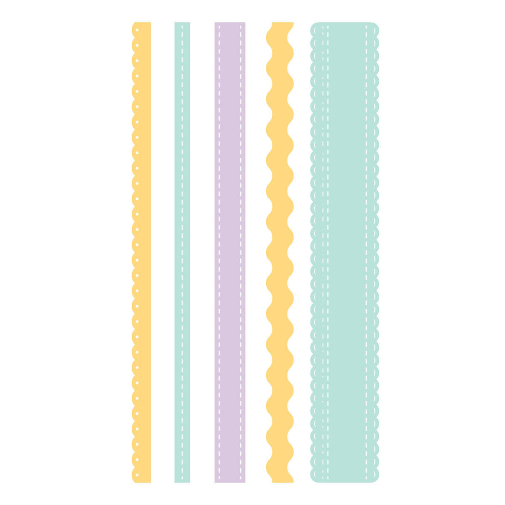 Ribbon & Trim Etched Dies are part of the Say Cheese Classic Pooh Baby Collection with Simple Stories. This sweet set cuts five different decorative edged designs. Cut them out twice to make a 12-inch length for scrapbook pages. Cut them out several times for a background. So many design opportunities with this set of five thin metal cutting dies!