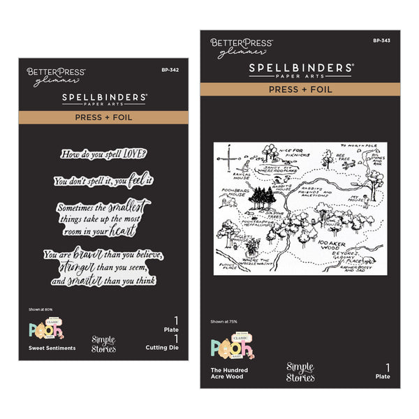 Say Cheese Classic Pooh Baby Press + Foil Plate & Die Bundle includes BP-342 Sweet Sentiments Press + Foil Plate & Die Set and BP-343 The Hundred Acre Wood Press + Foil Plate. Use them together to create stunning cards with the combination of a whimsical backdrop and a choice of seven encouraging sentiments.