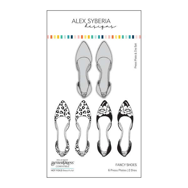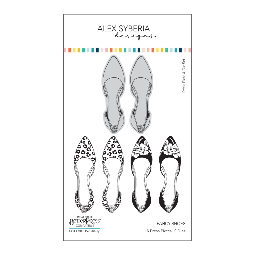 Alex Syberia Designs - Fancy Shoes Press Plate & Die Set Step into refined detail with the Fancy Shoes Press Plate & Die Set from Alex Syberia Designs. This set features stylish shoe illustrations along with patterned accents that press beautifully into paper using the BetterPress Letterpress System.
