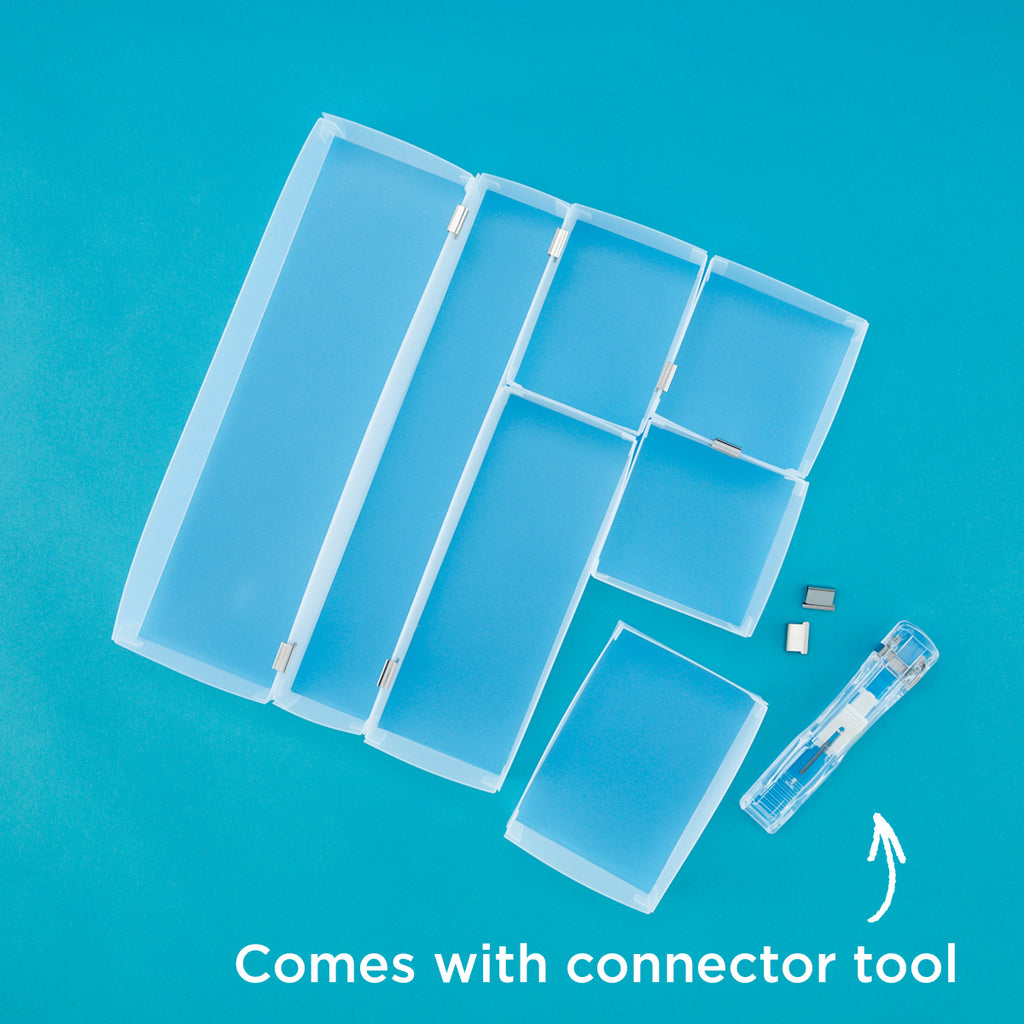 Are you ready to finally get your drawers under control? The Small Box Organizer Collection is your go-to solution for creating a custom fit system that works with your space, not against it. With seven mix and match Basic Boxes and our Creative Connector Tool (plus 8 Silver Clips), you can build the perfect layout for your desk drawers, bathroom essentials, toolbox compartments, and more.