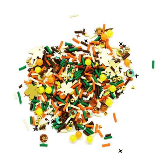 Fall Frenzy Mix Upz by Buttons Galore & More is a tablespoon mix full of shiny and colorful craft embellishments. The contents include a combination of brightly colored embellishments to add texture to cards, scrapbooks, and crafts. Use also as embellishments to jewelry, clothing, accessories, and nail art.