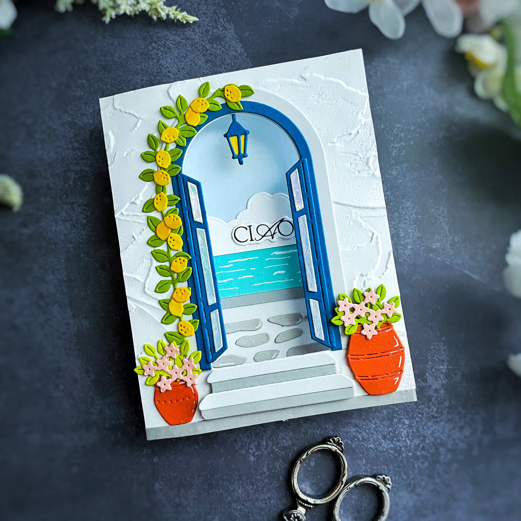 Beyond the Door Etched Dies are part of the La Dolce Vita Collection. This unique set of 29 thin metal cutting dies has all the makings of creating different scenes seen outside the entryway. Many details include cobblestones, clouds, vines and beyond! Even the door can be transformed into shutters, has a deeper frame and many more!