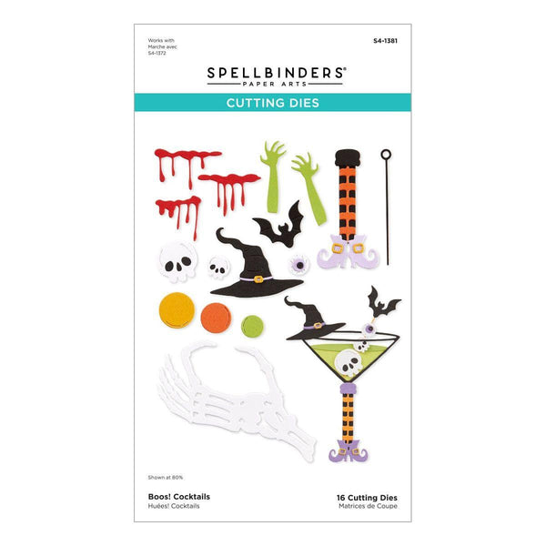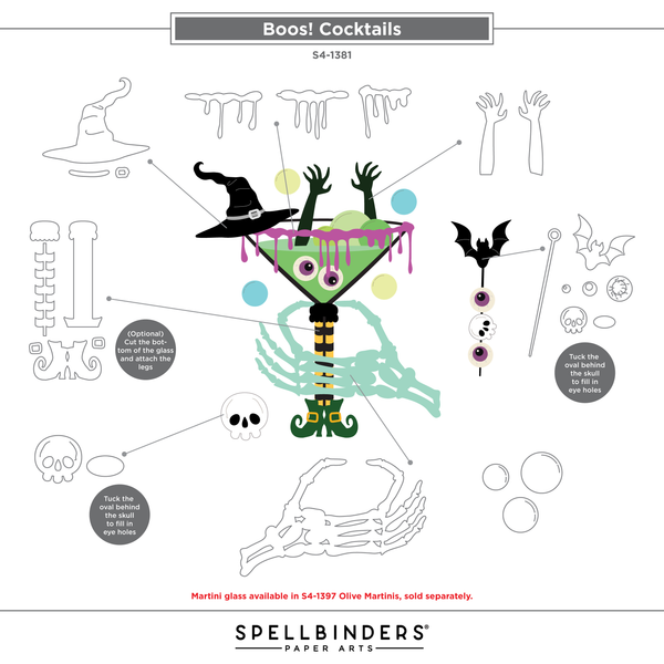 Boos! Cocktails Etched Dies are part of the Happy Hour Collection. Boo to You with this set of 16 thin metal cutting dies full of fun spooky accessories. Everything you need for a ghoulishly fun drink is included, even a Witch’s Hat! Use with S4-1372 Olive Martinis set for the glass base, or all on their own!