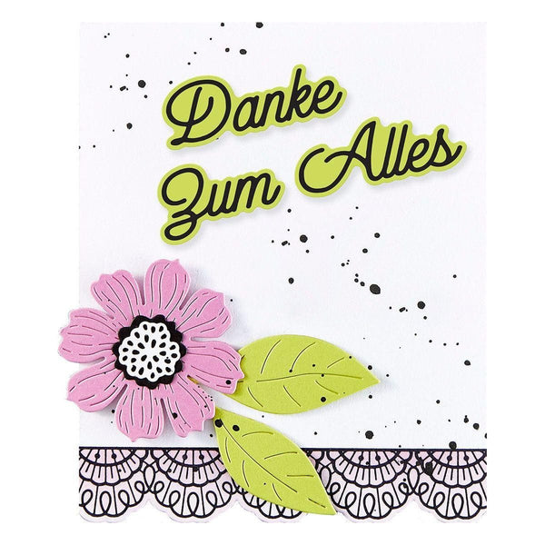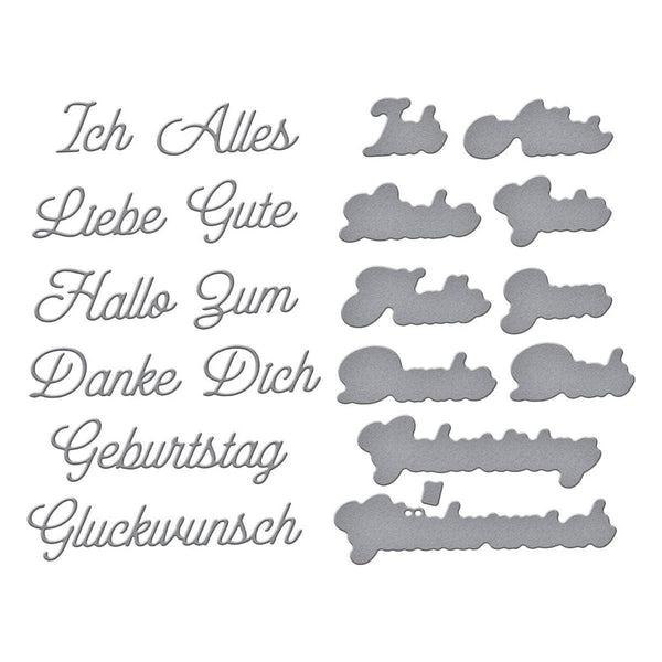 German Everyday Sentiments Etched Dies are part of the International Sentiments Collection. Many German phrases can be created in this set of 21 thin metal cutting dies. The fancy script font can be used in a narrow font or make it bolder by adding its matching shadow die. To expand your sentiment even more, try BP-266 German Sentiments Press Plate & Die Set to letterpress or foil for an impressive impression! Words include Ich/I, Alles/Everything, Liebe/Love, Hallo/Hello, Gute/Good, Danke/Thanks, Zum/For the, Dich/You, Geburtstag/Birthday, and Gluckwunsch/Congratulations.