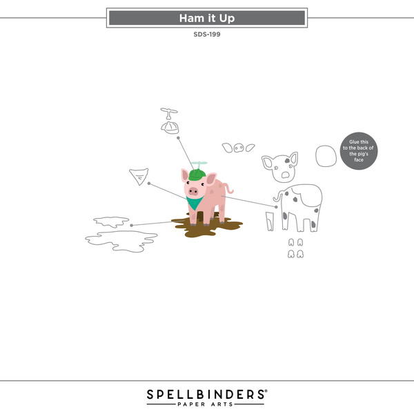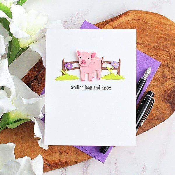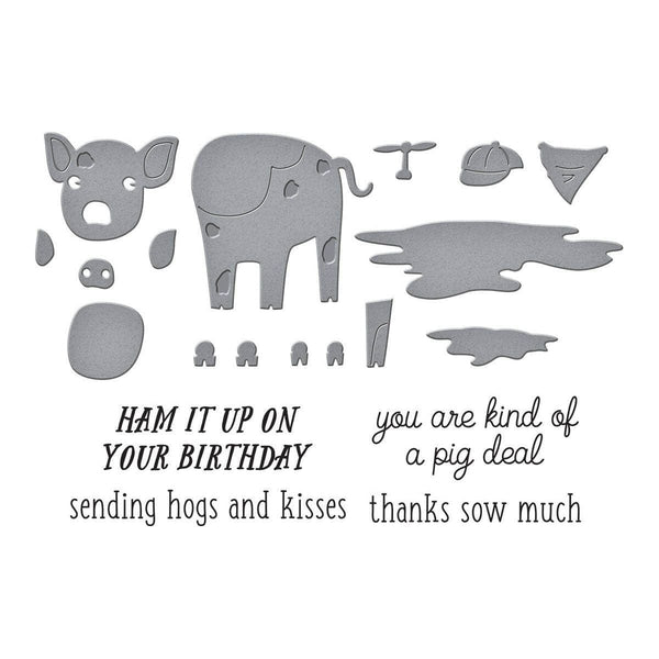 Ham It Up Clear Stamp & Die Set is from the On the Farm Collection. This sweet set of nine thin metal cutting dies creates a pig with a propelller cap and bandana, plus two mud puddle designs. Add in the four punny clear stamp phrases included in this set and cards come together in a flash with the perfect matching sentiment. Stamps include: Ham it Up on Your Birthday, You are Kind of a Pig Deal, Thanks Sow Much, and Sending Hogs and Kisses. Assembled Pig in Mud with Propellor Hat measures approximately 1.85 x 1.98 in./4.70 x 5.00 cm.