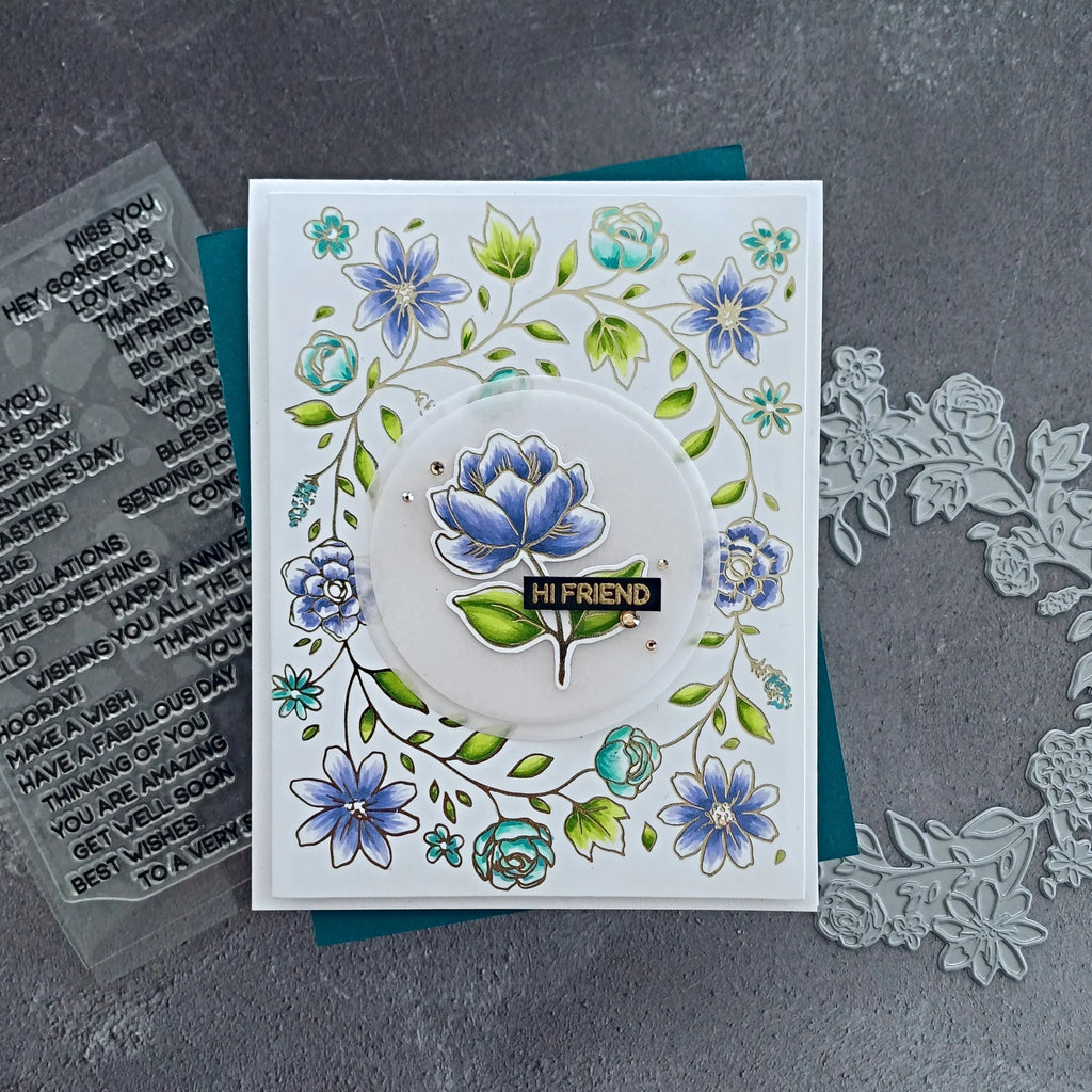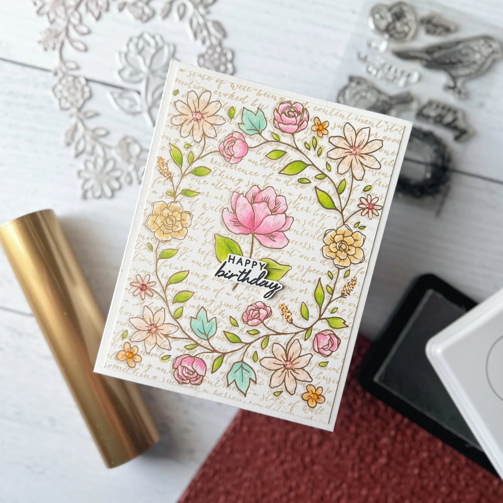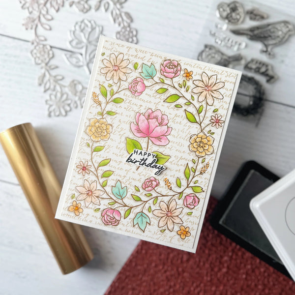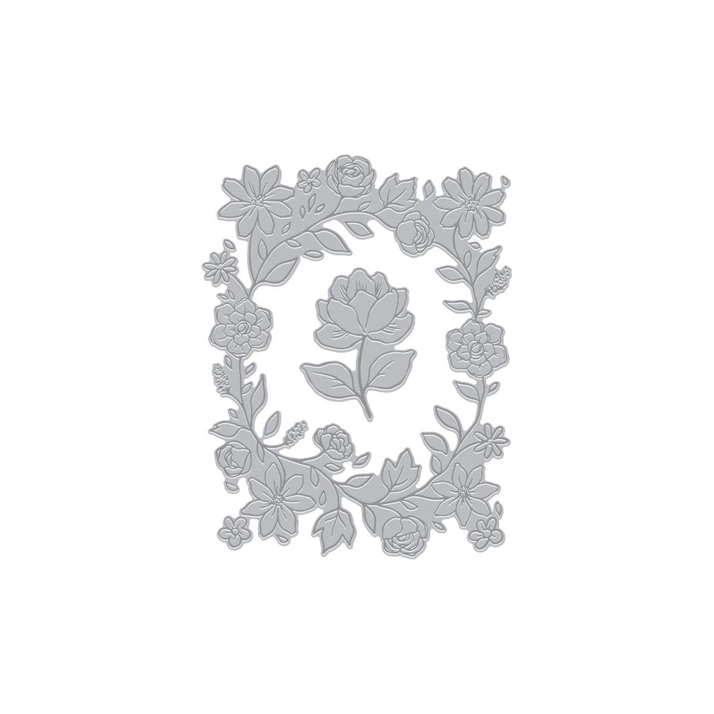 Floral Border Letterpress + Foil Plate from the Lovely LetterPress Collection The Floral Border BetterPress & Foil Plate Set is from the Lovely LetterPress Collection and creates a beautiful floral oval perfect for coloring. This A2 sized plate fills an entire cardfront with a pretty frame of roses, daisies and other flowers. The center of the plate is open, perfect for adding a sentiment or the single rose press plate also included in the set. Cards are so easy and impressive with this quick one-and-done plate!