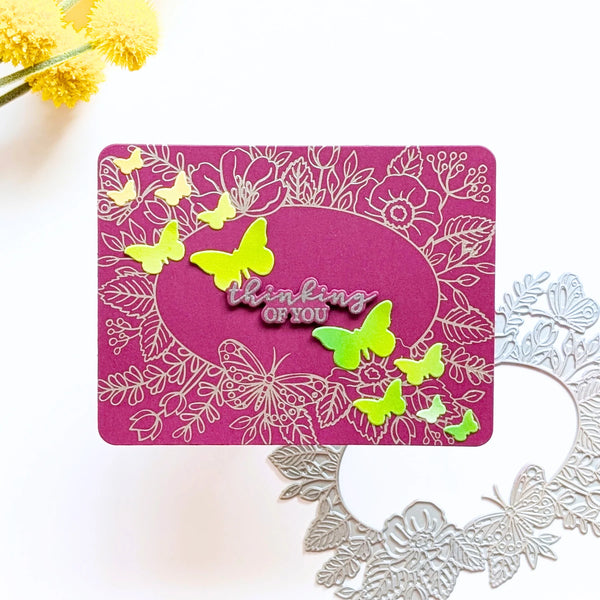 Floral Frame Letterpress + Foil Plate from the Lovely LetterPress Collection The Floral Frame BetterPress & Foil Plate is from the Lovely LetterPress Collection. This A2 sized plate fills an entire cardfront with a sweet spray of greenery and florals, with an elegant butterfly perched on the frame. The center of the plate is open, perfect for adding a sentiment or additional decorative element. Cards are so easy and impressive with this quick one-and-done plate!