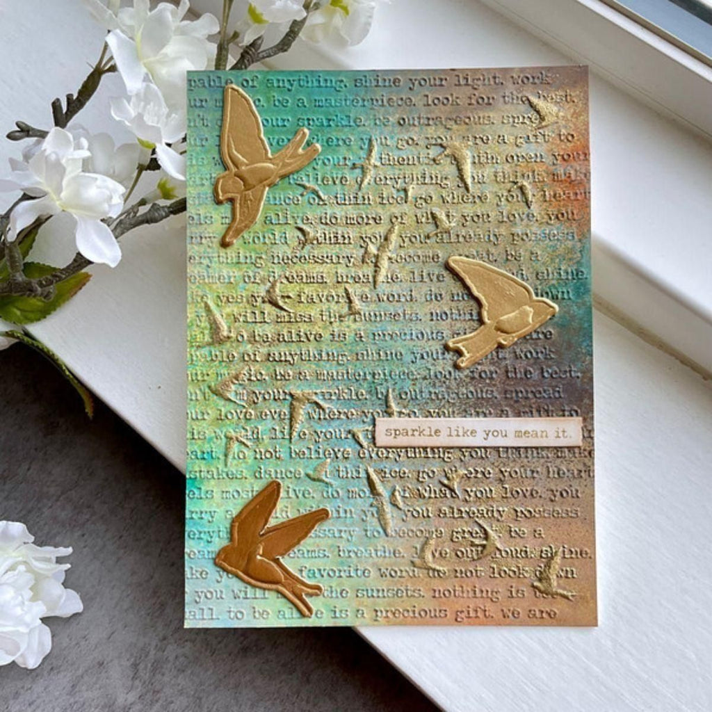 Soaring 3D Embossing Folder is from the Collaged Birds Collection by Dina Wakley. This embossing folder features a flock of soaring birds against a typewritten background. A lovely symbol of freedom, the textures and elegance of this folder makes a perfect backdrop for cards, art journals, scrapbooks and more. It covers a standard card front from a A2 to a 5 x7-inch to even the trendy slimline cards.