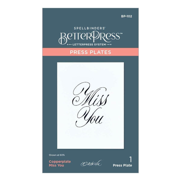 Copperplate Miss You Press Plate is from the Copperplate Everyday Sentiments Collection by Paul Antonio. This plate presses an elegant Copperplate script with the words 'Miss You.' Ink the plates with the BetterPress Ink to be pressed against the BetterPress Cotton Card Panel and Sheets for a crisp letterpress design.