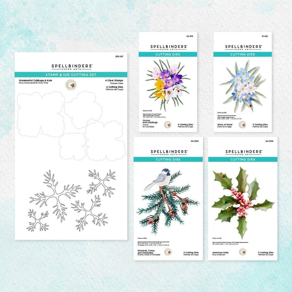 The Snow Garden Dies Bundle includes all of the dies in The Snow Garden Collection by Susan Tierney-Cockburn. With this bundle, you'll have everything you need to create stunning, dimensional floral bouquets to adorn your holiday projects. This bundle includes five die sets, S1-125 Glory of Snow Etched Dies, S2-375 Crocus and Ladybugs Etched Dies, S4-1305 Hemlock, S4-1305 Cones and Chickadee Etched Dies, S4-1306 American Holly Etched Dies, and SDS-187 Ornamental Cabbage & Kale Clear Stamp & Die Set.