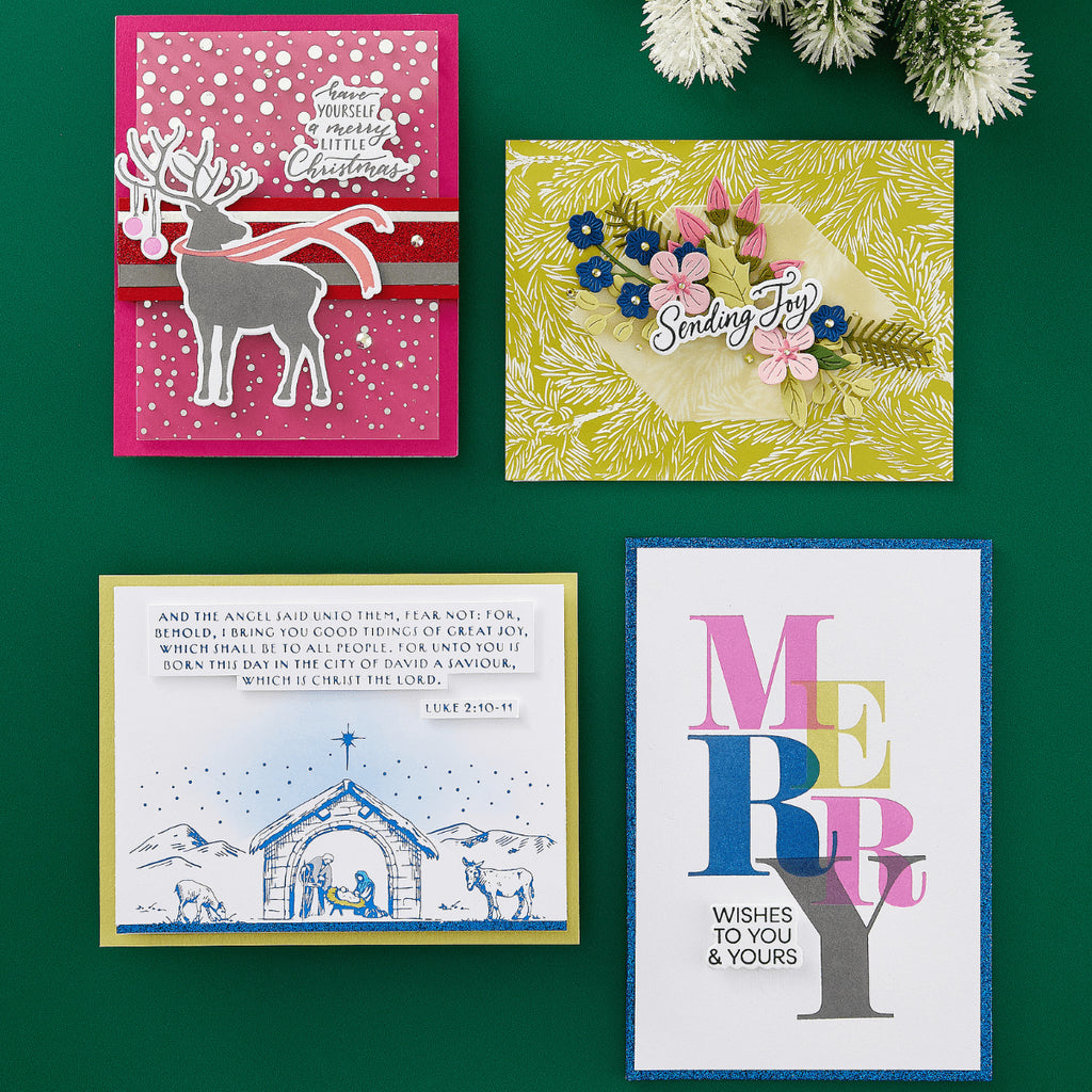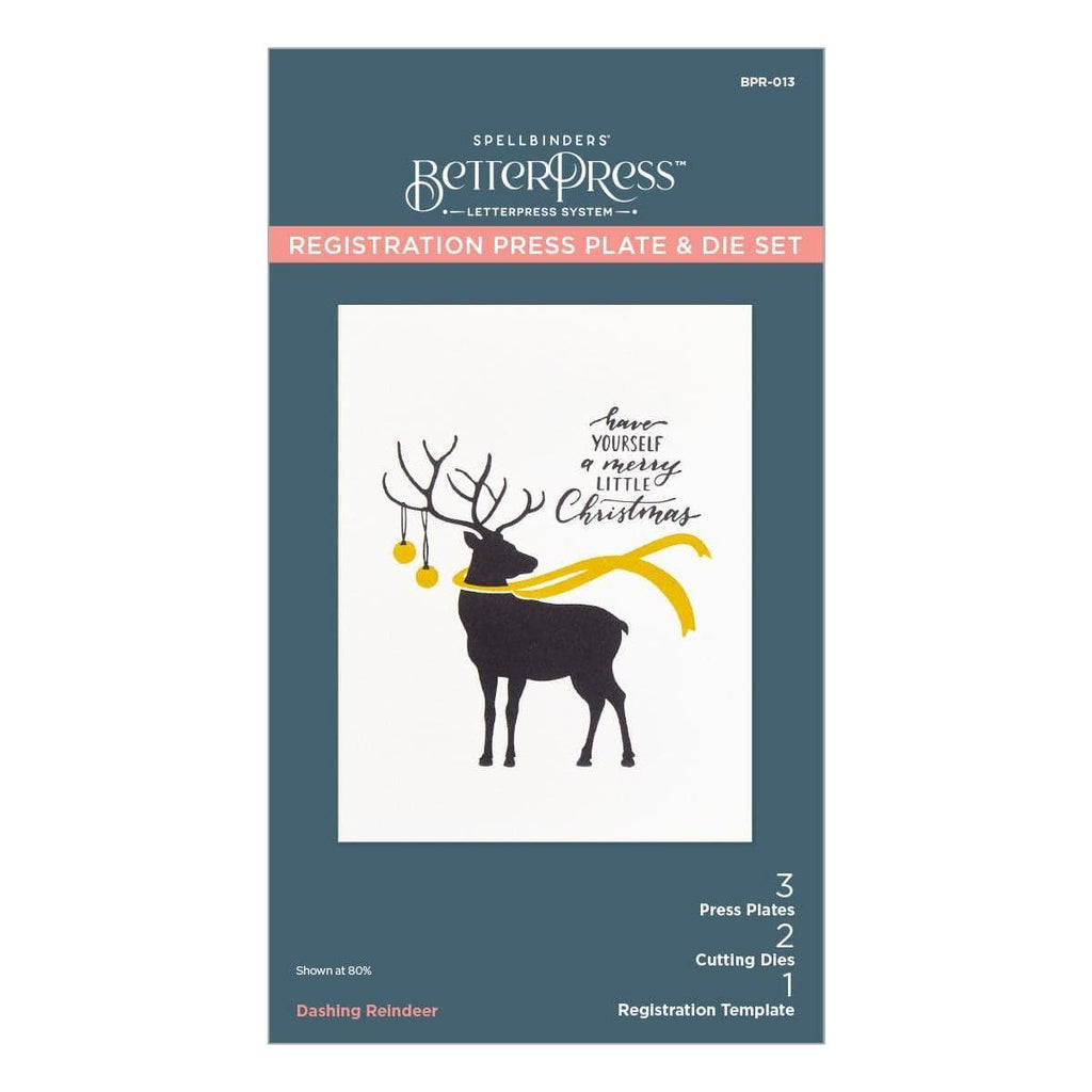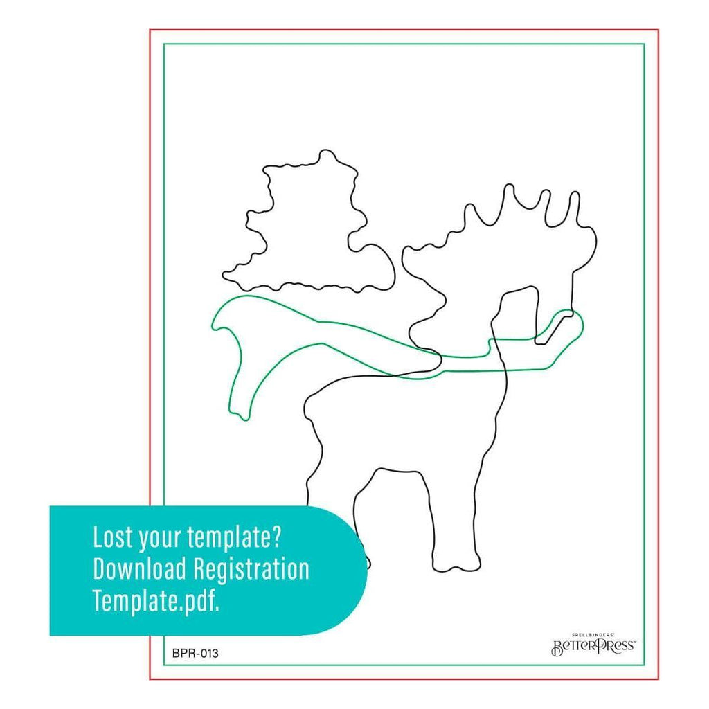 Dashing Reindeer Registration Press Plate & Die Set is part of the Home for the Holidays Collection. The set of three press plates, two thin metal cutting dies and one mylar printed registration template come together to create a multi-color magnificent reindeer with a flowing scarf and holiday ornaments. Also included is a wonderful holiday greeting and dies to cut out the reindeer and the sentiment.