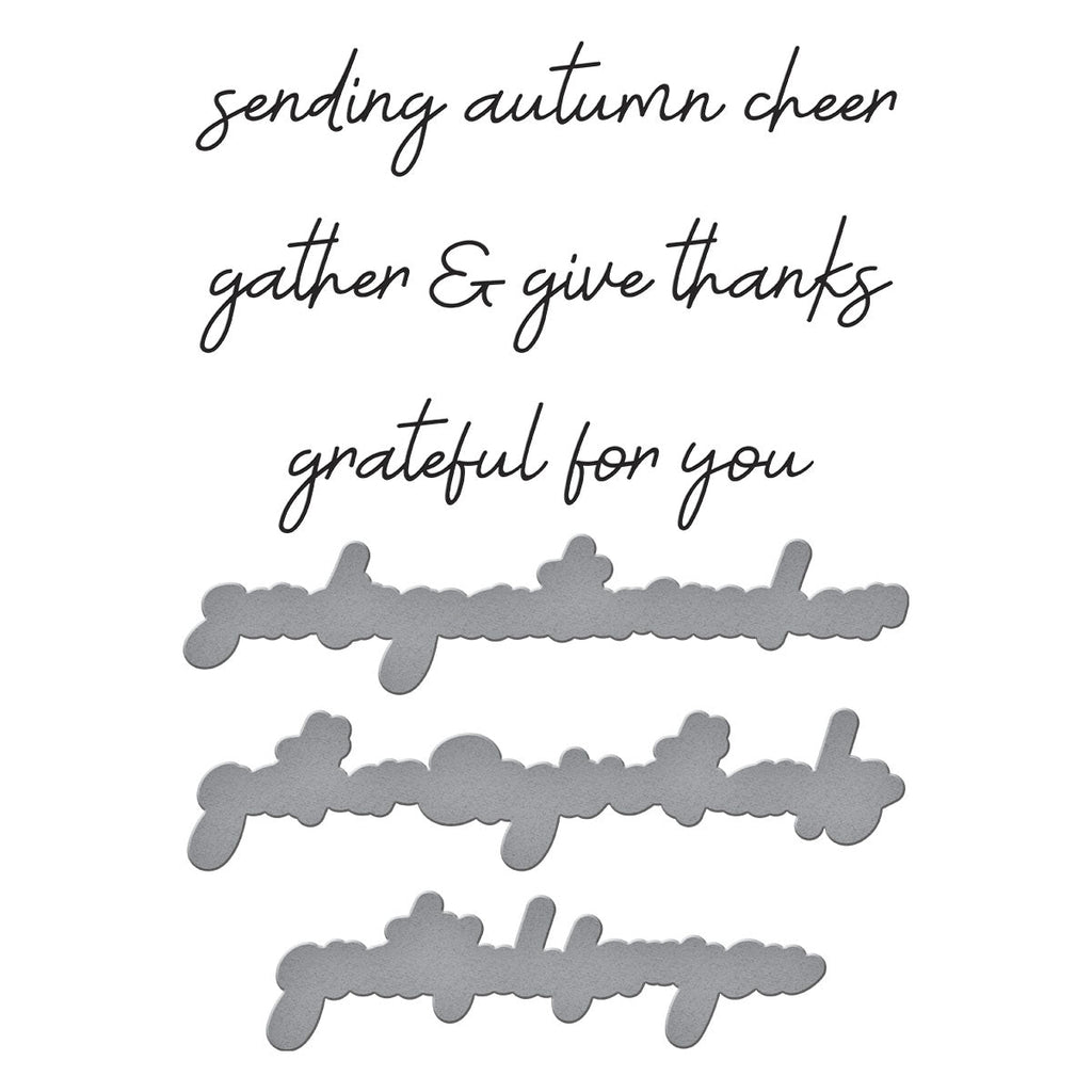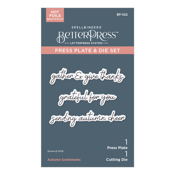 Autumn Sentiments BetterPress Plate & Die Set is from the Autumn Archives Collection by Kelly Bangs. Press three lowercase hand scripted sentiments all at once: sending autumn cheer, grateful for you, and gather & give thanks. Die-cut the sentiments with its coordinating thin metal cutting die. A time saving set to get you started with three sentiments.