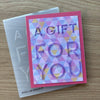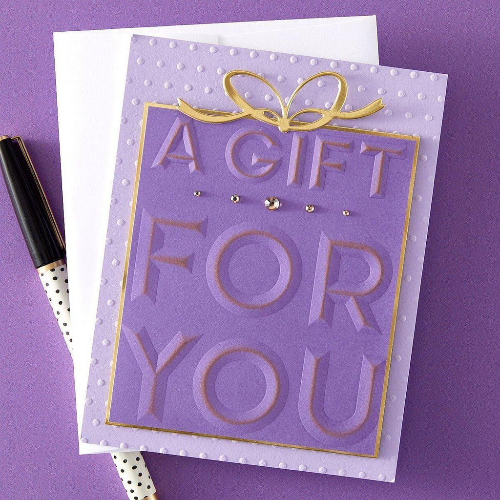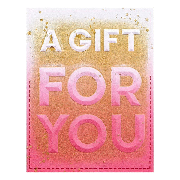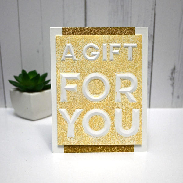 Beveled A Gift for You A2 Cardfront 3D Embossing Folder is part of the Beveled Sentiment A2 Cardfronts Collection. It embosses a stunning uppercase A Gift and a larger size uppercase For You sentiment in a cutting-edge bevel design that adds even more depth. Emboss once, place on an A2 size card base and done! Perfect to emboss on an inked panel with paint spatters for a mixed media effect.