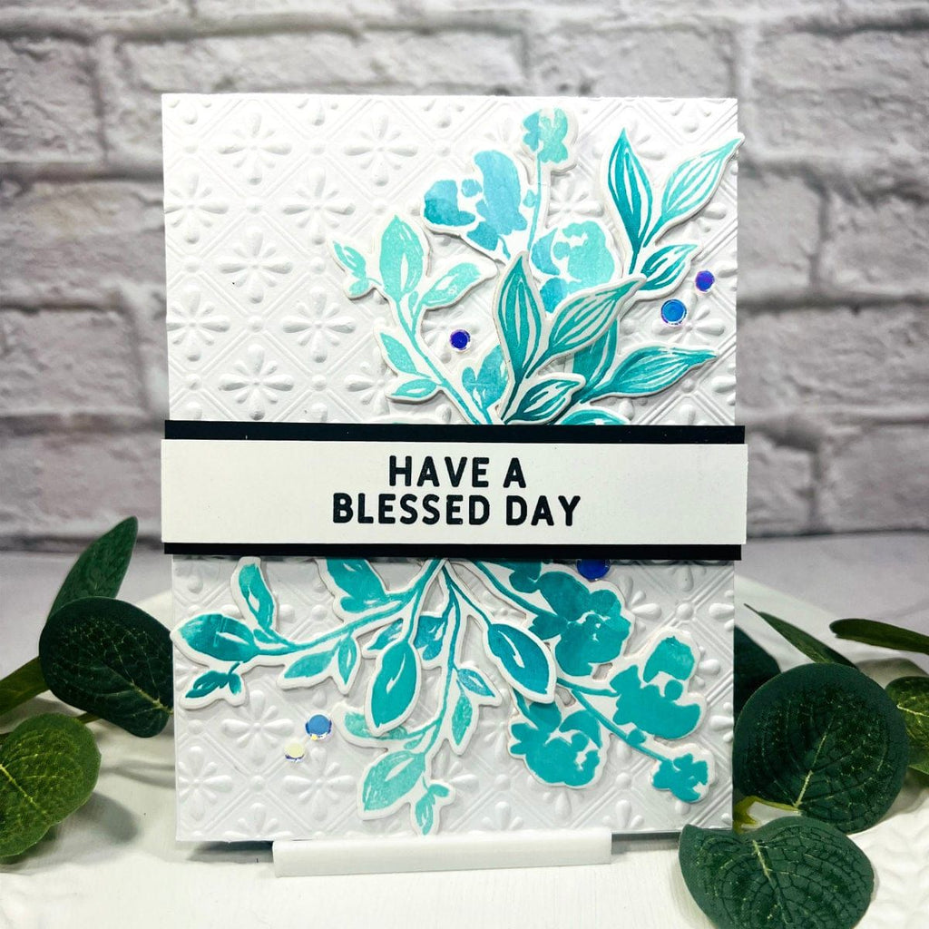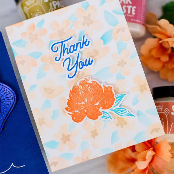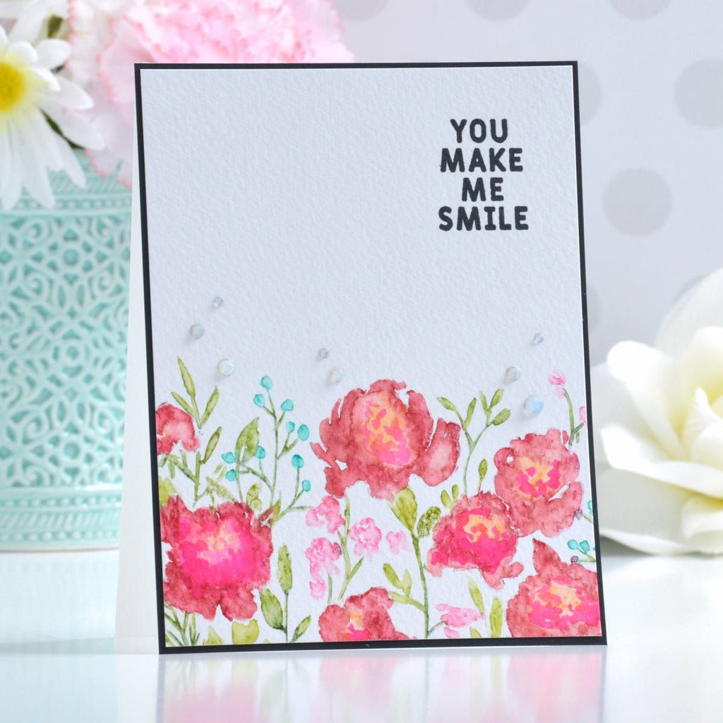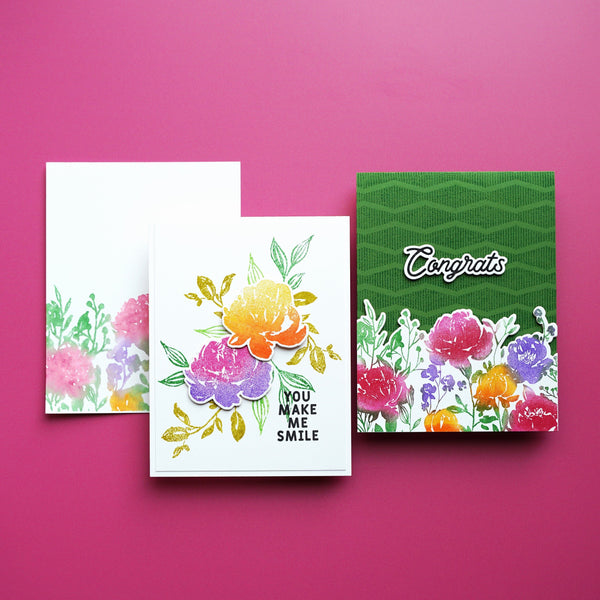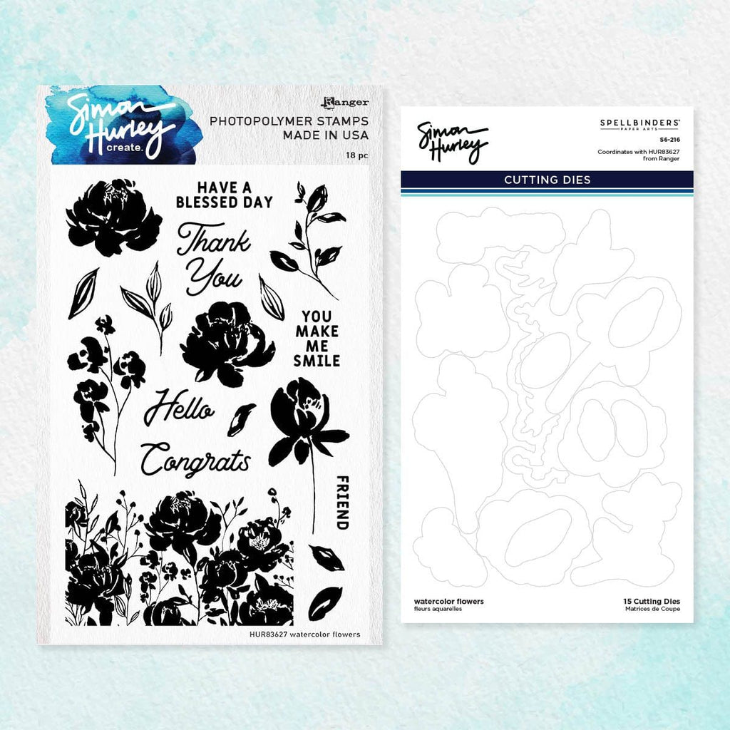 Watercolor Flowers Stamp and Die Set by Simon Hurley combines HUR83627 Ranger Watercolor Flowers Clear Stamp Set and Coordinating Watercolor Flower Etched Dies for a perfect pairing to cut out multiple blossoms and leaves to create a perfect floral arrangement! Stamp a lovely garden background, then cut it out with the coordinating die, then add additional flowers for a gorgeous dimensional garden. Many options for your card creations!