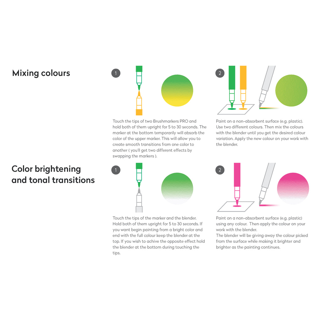 Karin Brushmarker PRO markers each contain 2.4 ml of water-based paint. Thanks to the “liquid ink” technology featured in Karin markers, the ink remains consistent in quality and vibrancy until the last drop. They are twice as efficient as traditional filter markers. In addition, they are equipped with a Japanese super durable and flexible nylon tip. They contain non-toxic paints with intense dye-based color. The colors can be mixed and lightened, plus tonal transitions can be achieved by contacting the ends of two different marker tips. Store vertically.