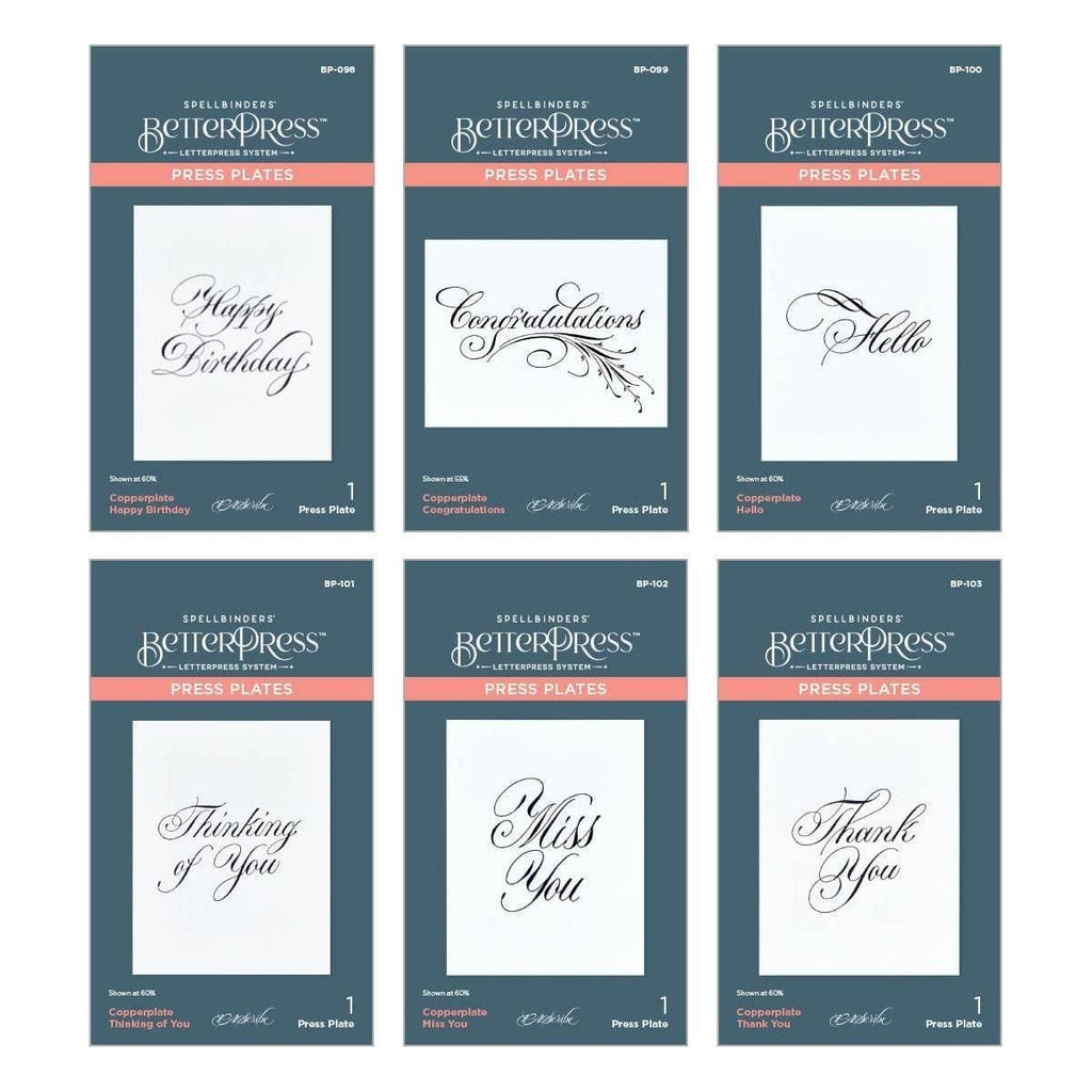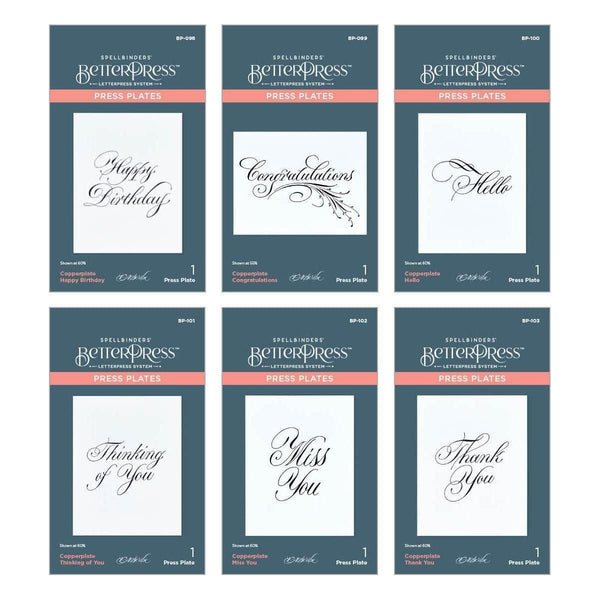 I Want It All! Copperplate Everyday Sentiments Bundle has everything in the Copperplate Everyday Sentiment Collection by Paul Antonio - so no need to choose! It includes press plates sets of BP-098 Copperplate Happy Birthday, BP-099 Copperplate Congratulations, BP-100 Copperplate Hello, BP-101 Copperplate Thinking of You, BP-102 Copperplate Miss You, and BP-103 Copperplate Thank You. $81.33 value!