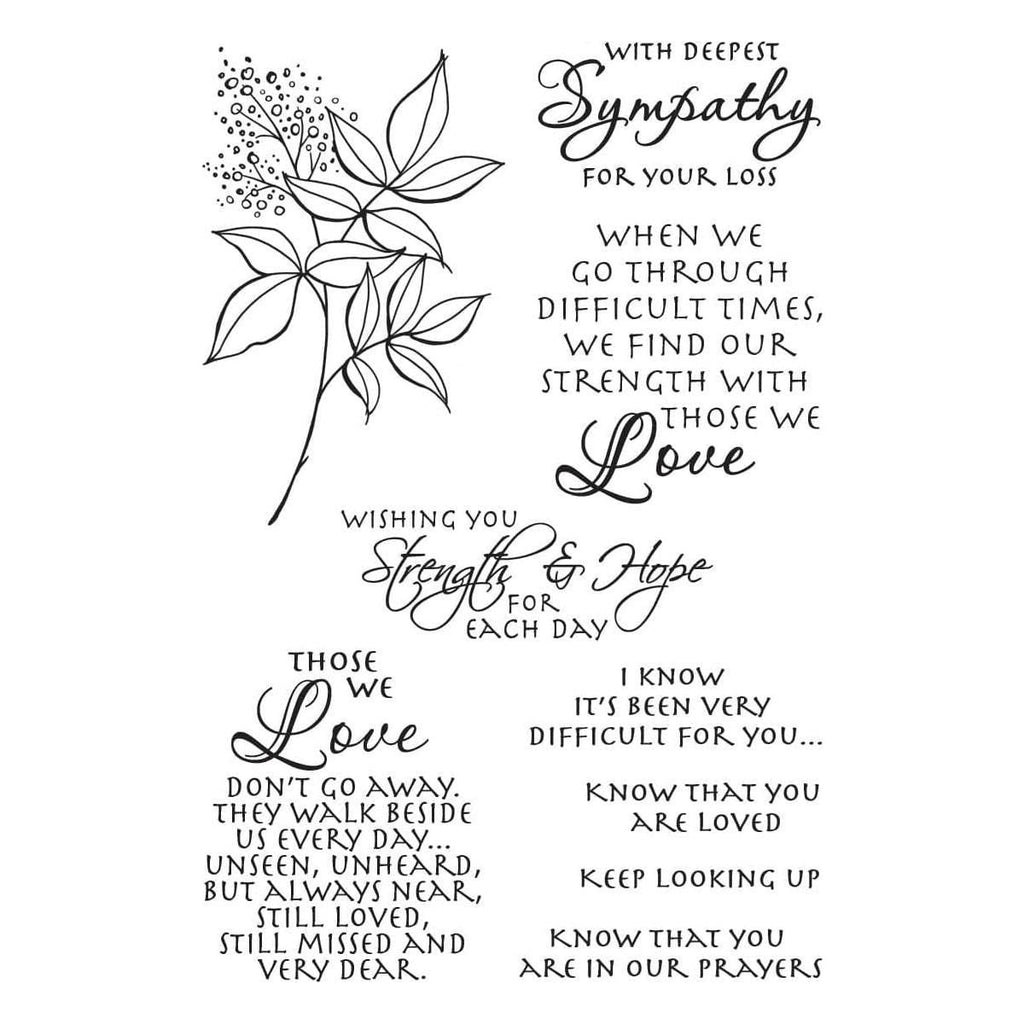 Sincere Sentiments Clear Stamp Set is part of the All the Sentiments Collection by Stampendous with a set of nine stamps. Send expression of comfort during difficult times through this set. There are several to choose from and comes with a sweet floral sprig for just the appropriate accent.