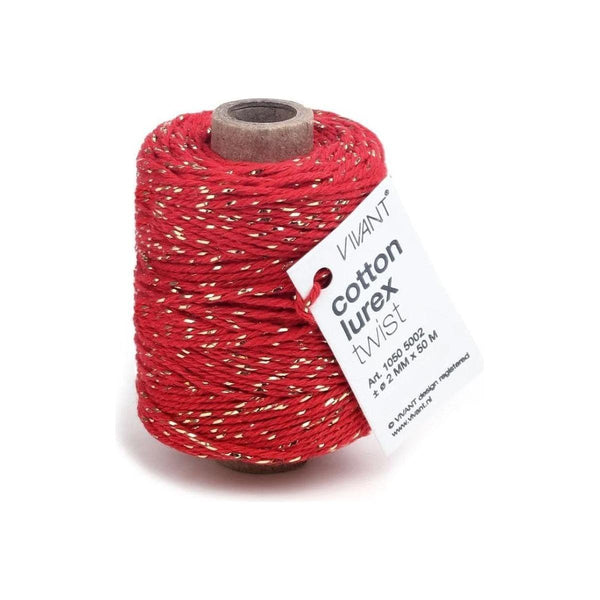 Lurex Red Cotton Cord by Vivant is a versatile and stylish crafting material that will add a touch of sophistication to any project. This spool of cord contains 54.68 yards of cotton thread infused with metallic lurex in a chic and modern red color. 98% Cotton, 2% Lurex
