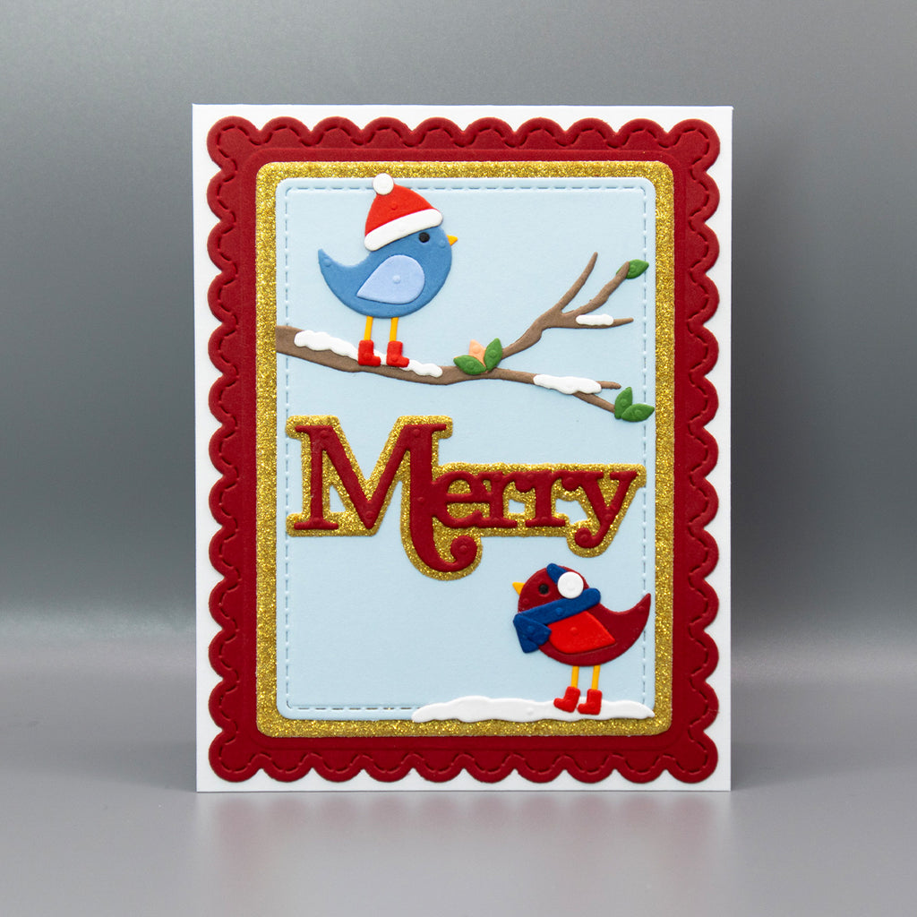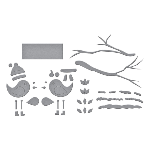 Little Birdies Etched Dies are from the All About Christmas Collection by Lisa Horton. Assembled, this set of 13 thin metal cutting dies creates two sweet little birds! Give them personality by adding a hat, scarf, earmuff and more. Also, in the set are branches, perch and even add snow on them. So cute!