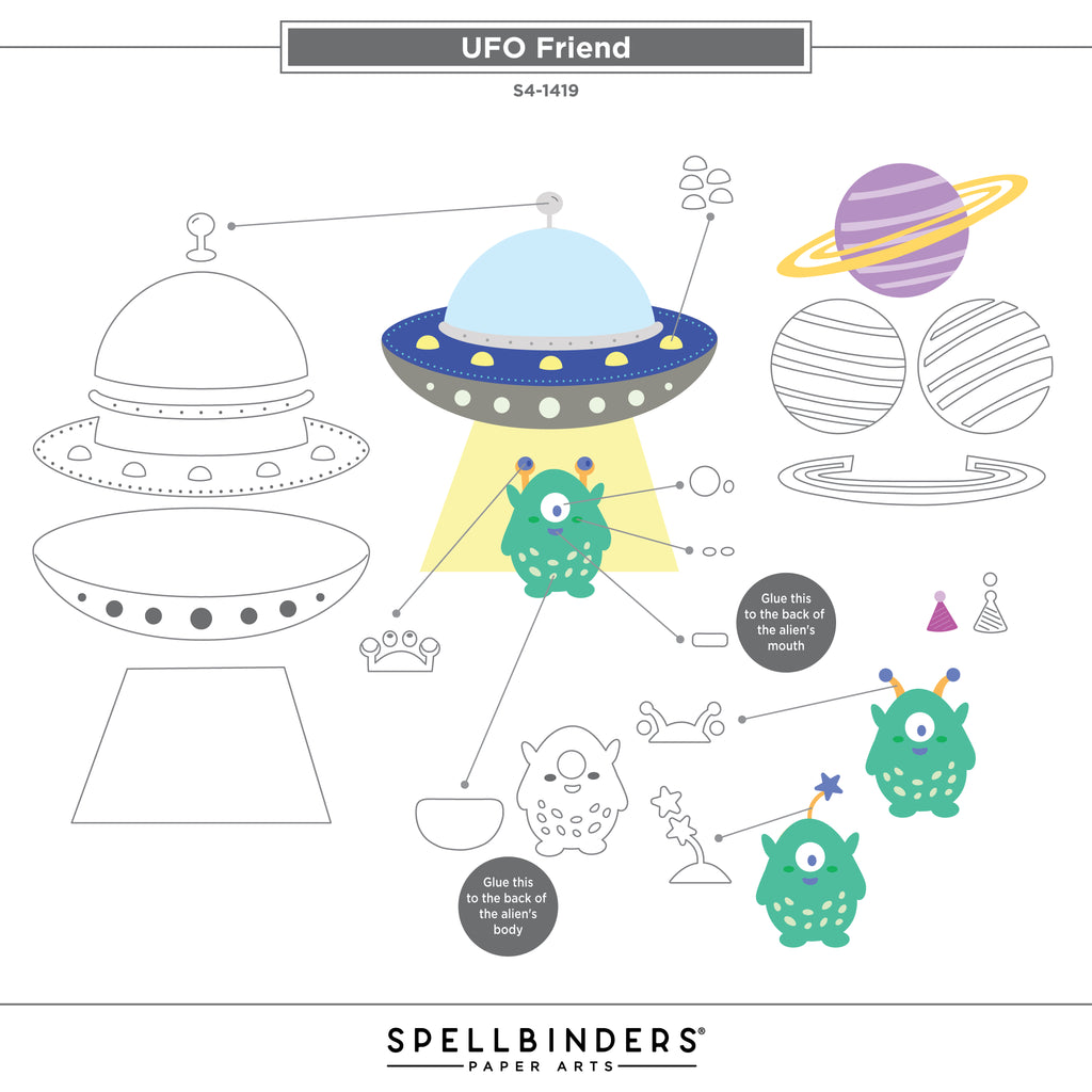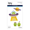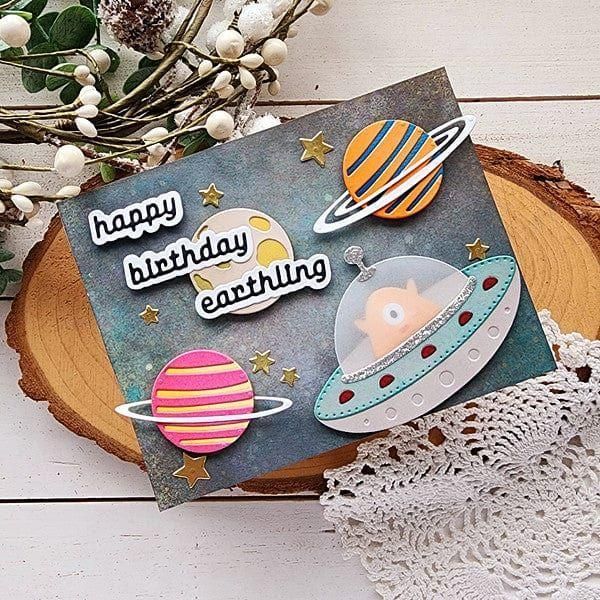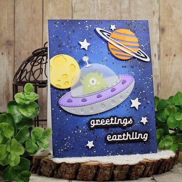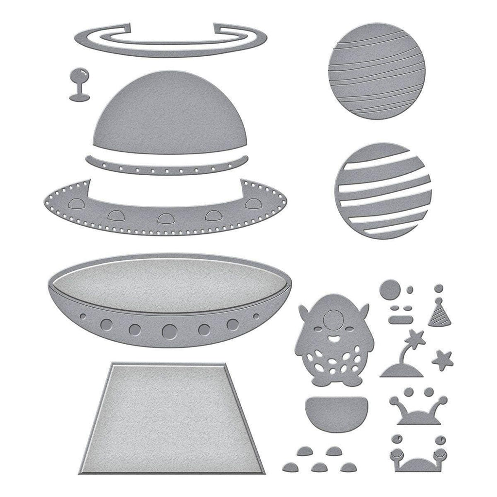 UFO Friend Etched Dies are part of the Space Adventure Collection by Simon Hurley. The set of 17 thin metal cutting dies assembled, makes a fabulous spaceship that includes an alien pilot with a beaming light to boot! The set also includes a planet with its rings and some accessories to accent your projects. Use them in any of your manual die-cutting machines. OR create on the go with the NEW PS-019 Simon Hurley – Platinum Scout Die Cutting & Embossing Machine 3.5” Platform!