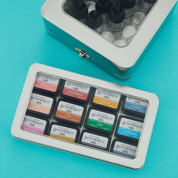 Ranger - Mini Archival Ink Storage Tin is your perfect storage companion for BetterPress Ink Pads. Simplify the organization and transportation of your ink collection with this handy, hinged tin featuring a clear window. With built-in dividers, it effortlessly accommodates and grants easy access to as many as 12 BetterPress Ink Pads. It's compact and practical.