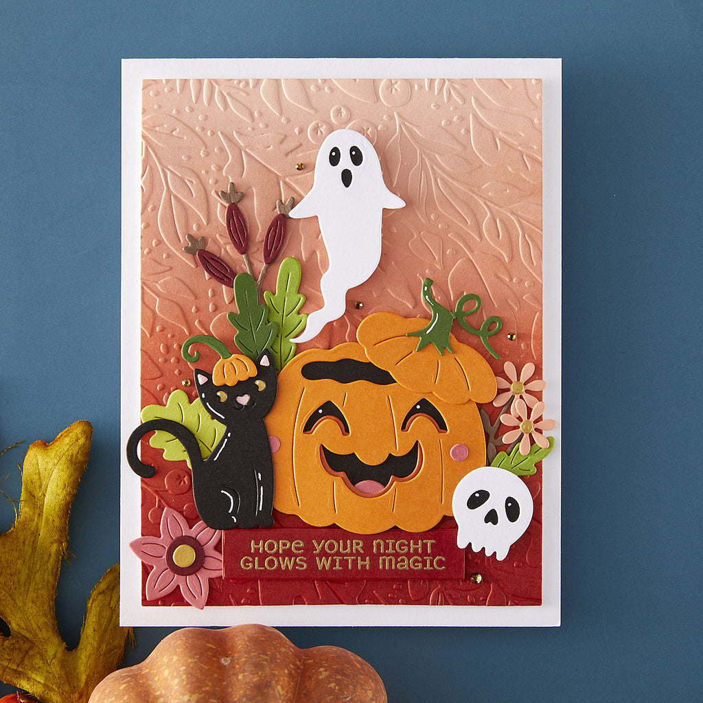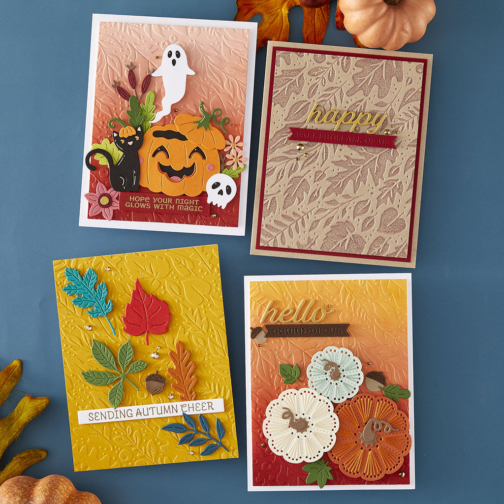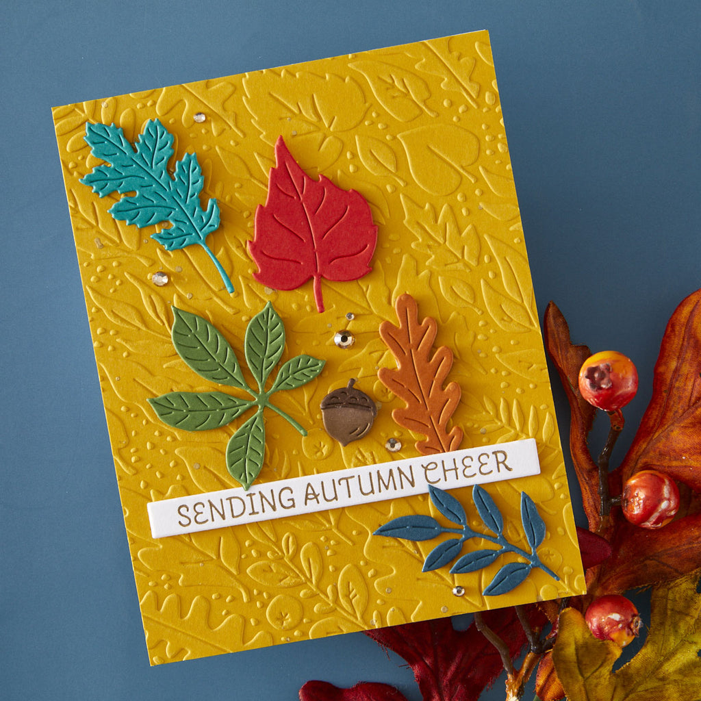 Let the beauty of fall sweep across your projects with the Autumn Breeze Embossing Folder of the Month. This elegant all-over design features a swirling mix of oak, maple, and fern leaves intertwined with delicate berries and branches, capturing the effortless movement of an autumn day.