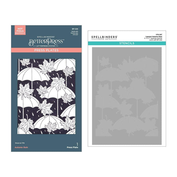 Autumn Rain BetterPress and Stencil Bundle is part of the Falling Leaves Collection and includes BP-224 Autumn Rain Press Plate and STN-097 Layered Autumn Rain Stencil. Together, it depicts a rainy fall day with umbrellas popped open. Add falling leaves to complete this fun design. Use other mediums with the Layered Autumn Rain Stencil for more interest. Note the five sheet mylar stencil set is only available in this bundle.