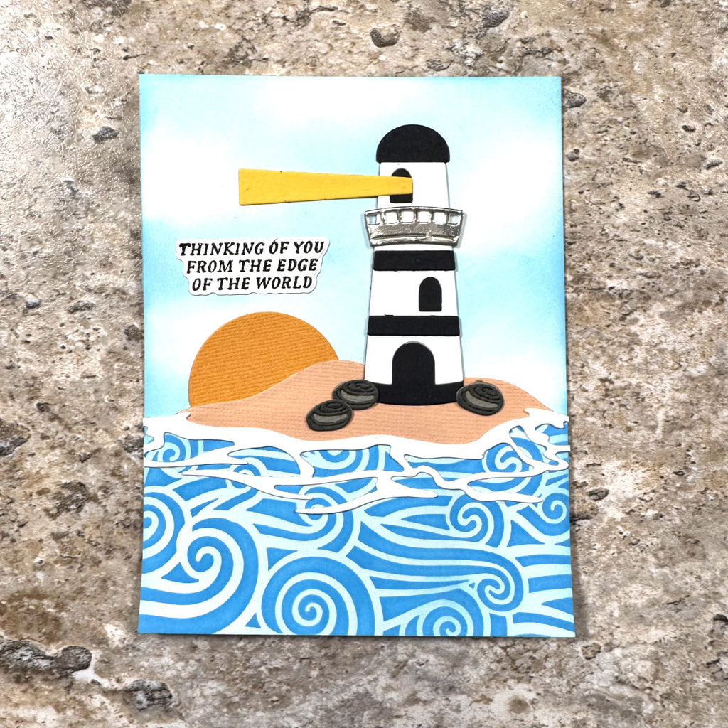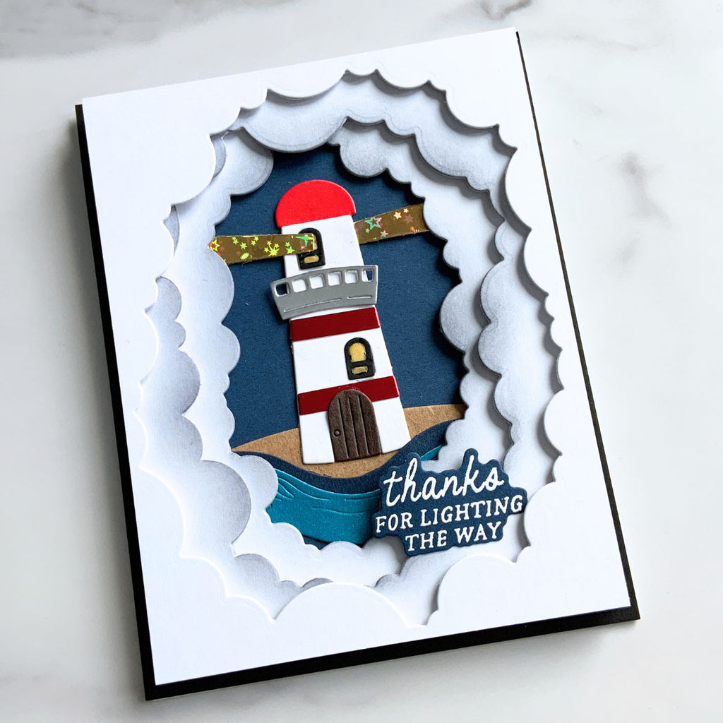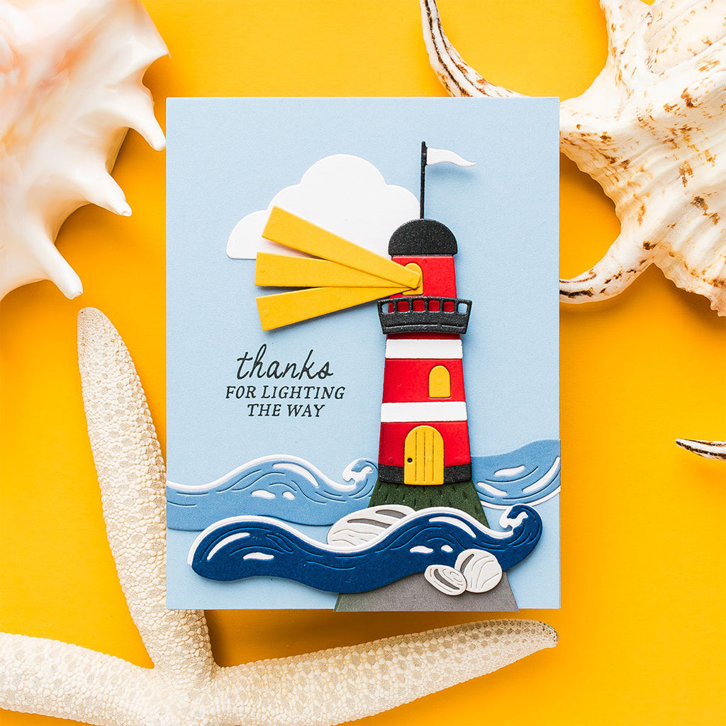 Shine a light on seaside scenes with the Sailor’s Day Large Die of the Month! This 31-piece detailed layering set builds a charming lighthouse with cozy coastal cottages, swirling waves, rocky shores, and puffy clouds—perfect for storytelling and dimensional cardmaking.