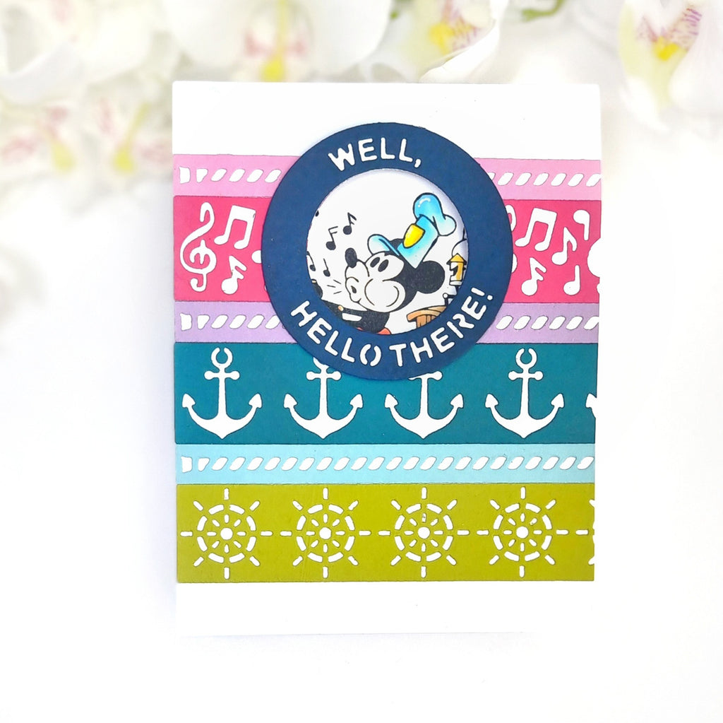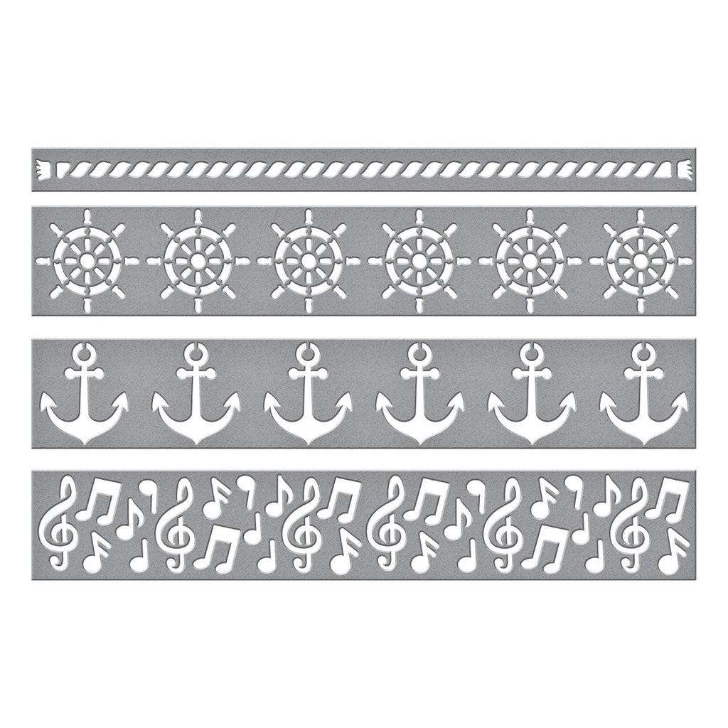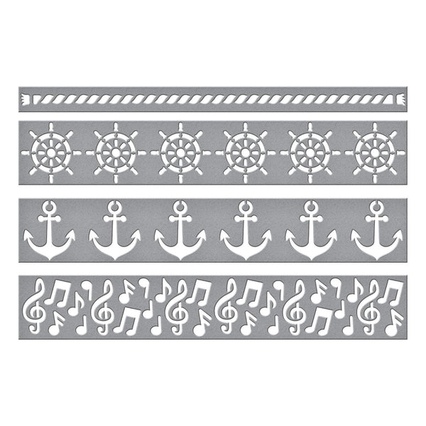 Classic Mouse Borders Etched Dies are from the Say Cheese Classic Mouse Collection and give the perfect touch to all your scrapbook pages and cards. This set of four borders channels Steamboat Willie's nautical origins and includes borders featuring an anchor, rope and helm, plus one full of music notes to whistle along with. With repeating patterns, these borders can be cut multiple times to create borders than stretch to any length. Use just one on a scrapbook page for a grounding element, or try all four together for an unforgettable card.