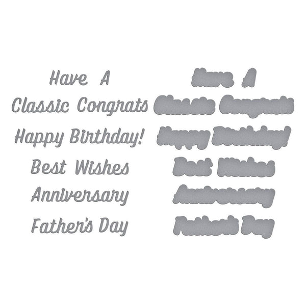 Classic Sentiments Etched Dies are from the Classic Road Legends Collection by Mindy Eggen. Using the set of 22 thin metal cutting dies, there are many different greetings that can be assembled in a causal print font with matching outlines. From birthday, anniversary, best wishes to even Happy Father’s Day, it is a versatile sentiment set to have!