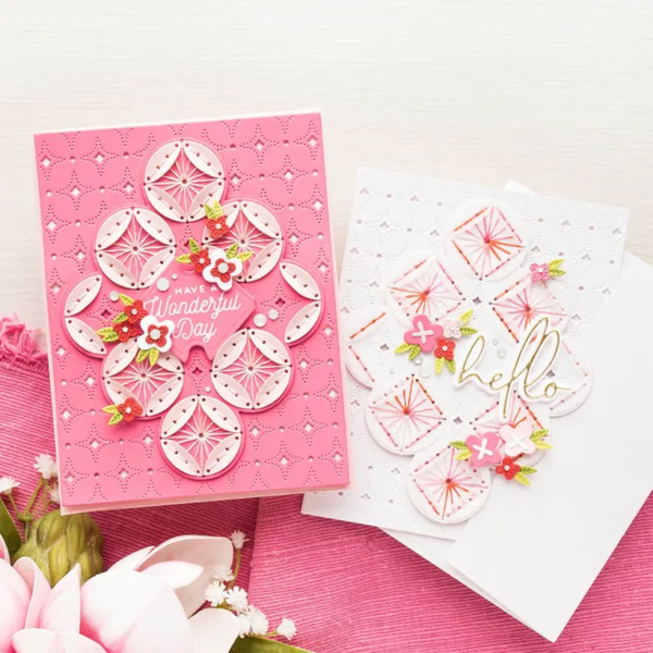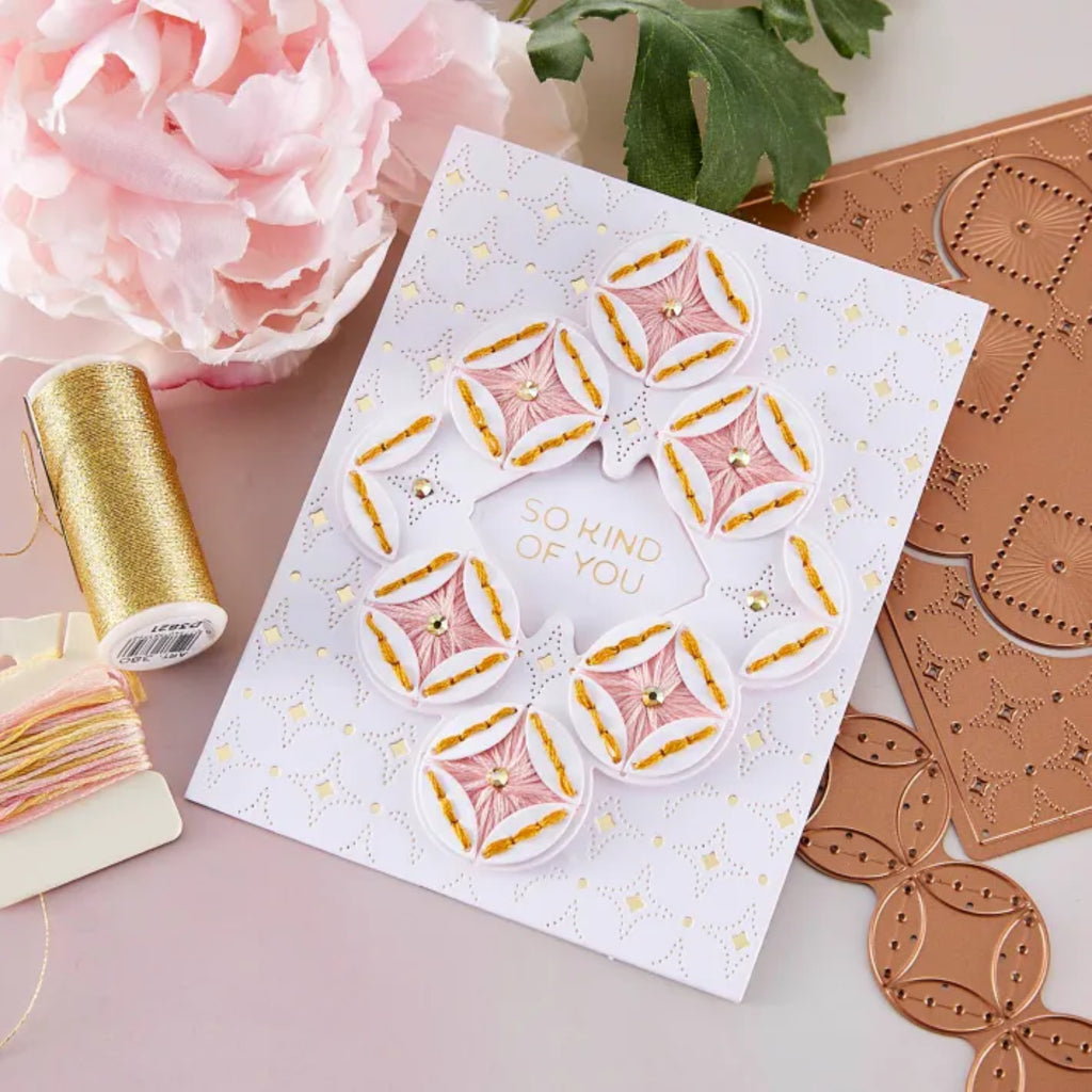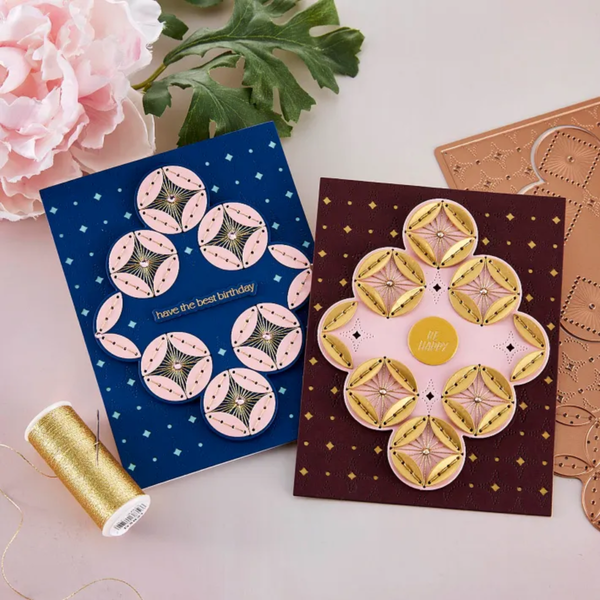 Nested Layered Stitched Petal - Stitching Die of the Month 4-piece Die Set, cuts, embosses, debosses, and stencils. Released March 2023 to our Stitching Die of the Month Club creates a bursting geometric design. Use to create cards, décor, gift card holder, gifts, and more! Add stitching to have even more textures in crafts.