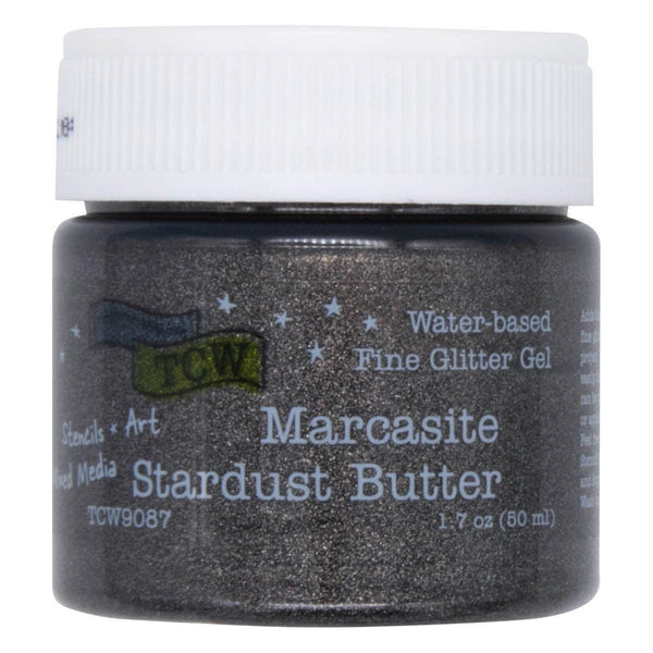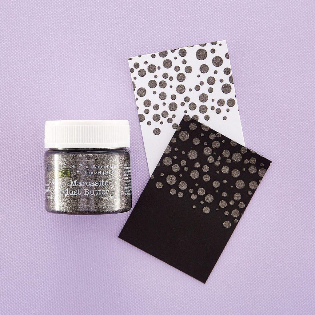 The Marcasite Stardust Butter offers a spreadable and glittery solution to enhance texture and add dimension in any project. This clear gel contains superfine suspended glitter that smoothly spreads through a stencil or can be brushed on with a brush or palette knife.