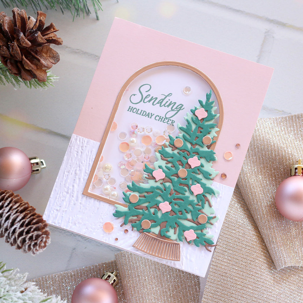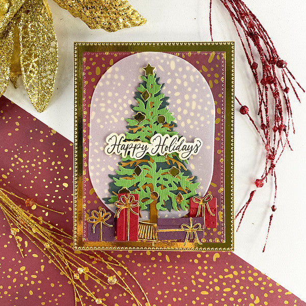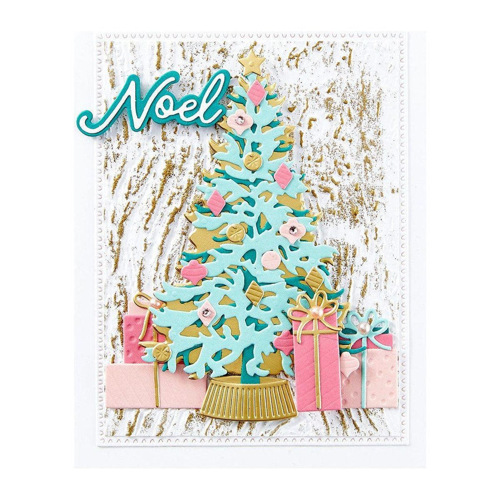 Classic Christmas Tree Etched Dies are from the Timeless Trees Collection by Simon Hurley. Cut and assembled, this set of 14 thin metal cutting dies creates a beautiful traditional Christmas tree with all the trimmings and a pile of gifts around its foot. Not one detail is missed, from the ornament shapes, the star topper, all the way to the bows on the gifts. Use different tones of green cardstock in the tree layers for more dimension and interest.