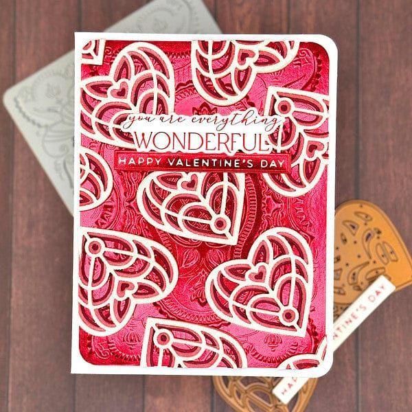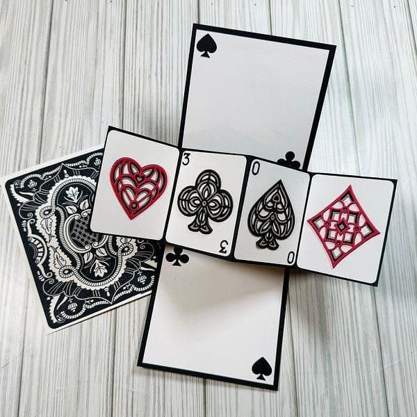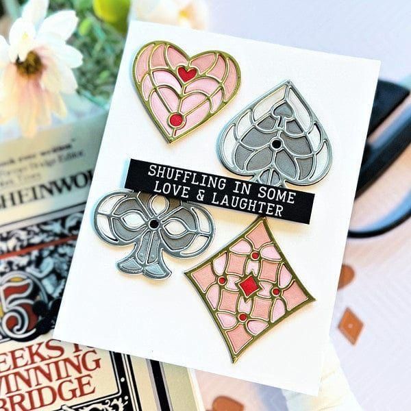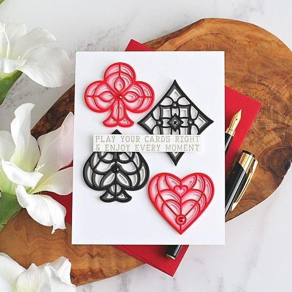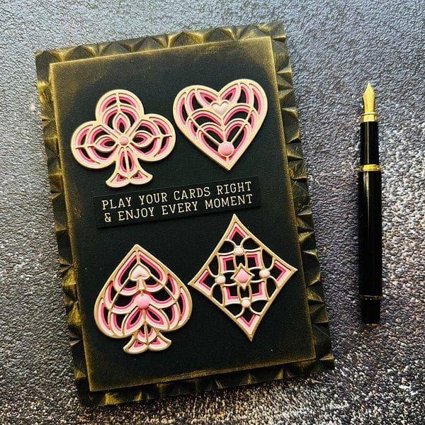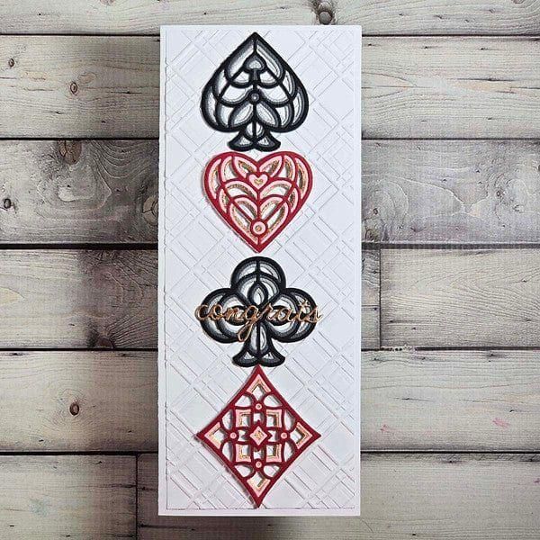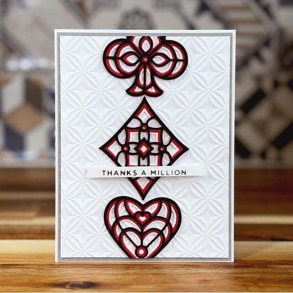 Kaleidoscope Noble Suits Etched Dies are part of the Jack of All Trades Collection by Jaycee Gaspar. Make an ornate and dimensional card suit motifs of the heart, diamond, spade and club for a unique element for your projects. Create a border or a repeat pattern as a background….stunning!