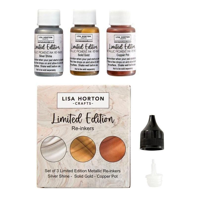 Lisa Horton Crafts Set of 3 Ltd Edition Metallic Reinkers - Introducing the limited edition Metallic Ink in Silver, Gold and Copper from Lisa Horton Crafts—a premium dye-based ink designed for versatility and superior performance. This highly pigmented, water-reactive ink blends effortlessly and delivers a metallic finish, making it ideal for various water-based techniques and stencil creations. Nontoxic and acid-free, this ink ensures safe and vibrant results on all your crafting projects.
