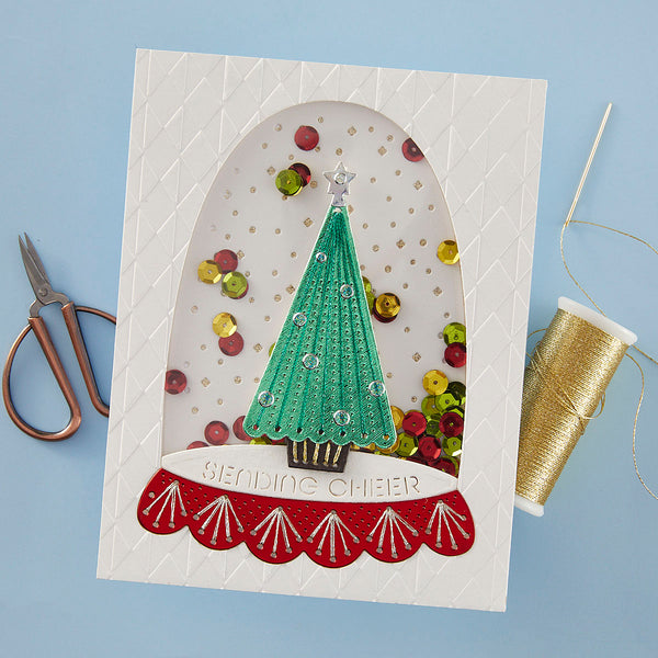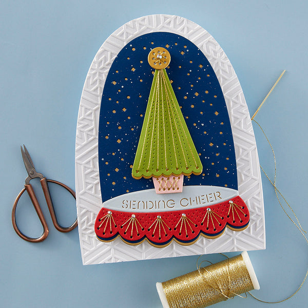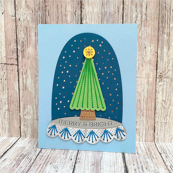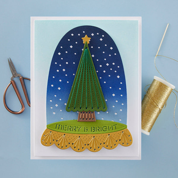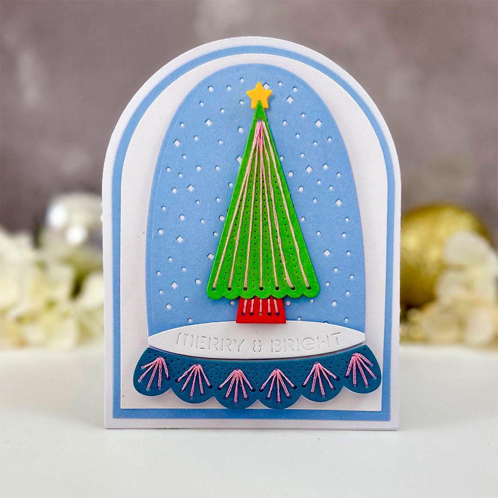Merry & Bright Cloche- Stitching Die of the Month Die this 13-piece die set released October 2024 to our Stitching Die of the Month Club creates a fun paint palette. Use to create cards, décor, gift card holder, gifts, and more! Add stitching to have even more textures in crafts.