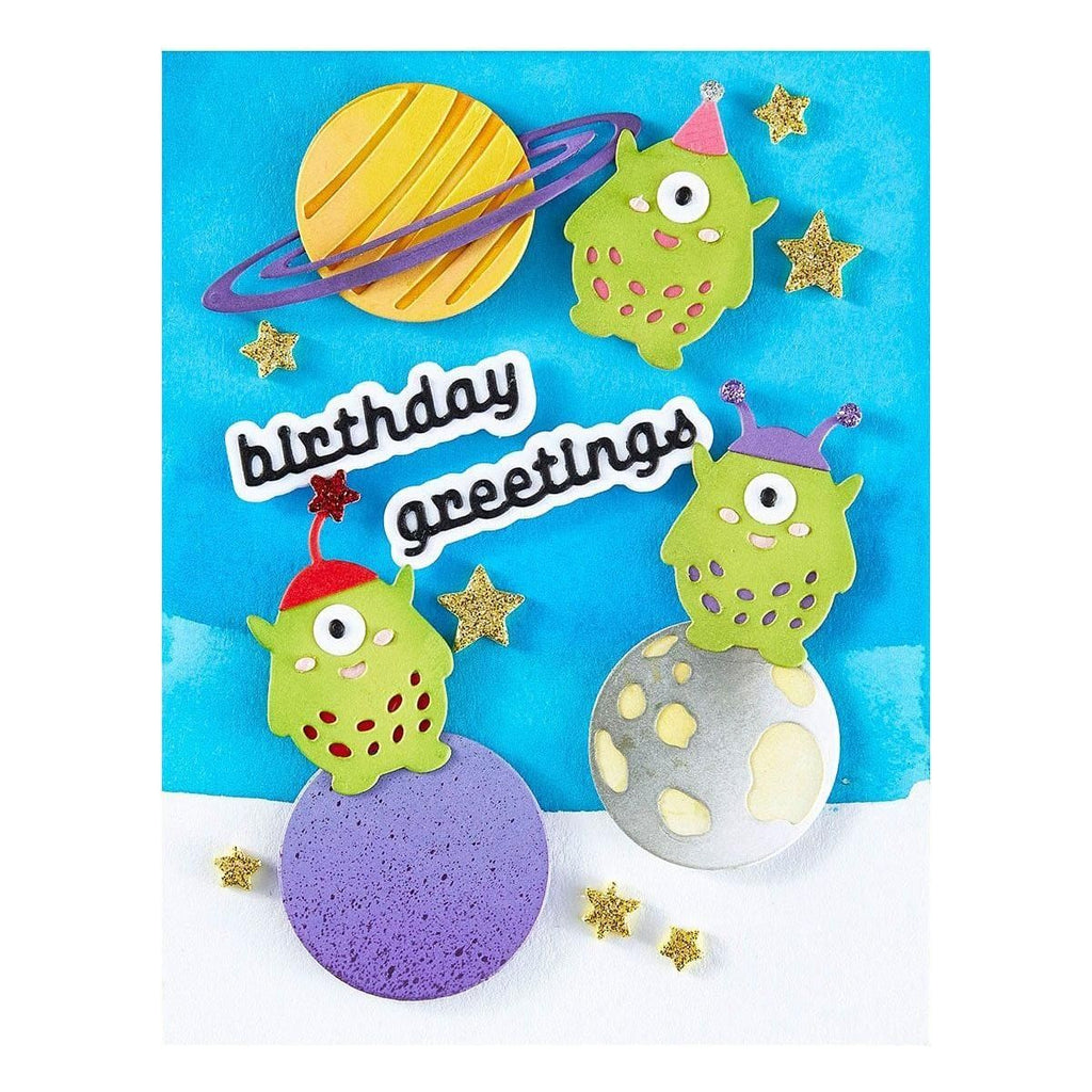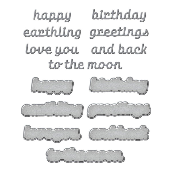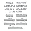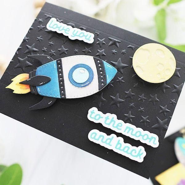 Space Greetings Etched Dies are part of the Space Adventure Collection by Simon Hurley. Put together greetings that pairs well with the rest of the set in this collection. The set of 14 thin metal cutting dies cut lowercase casual script words of love you, to the moon, and back, happy, birthday, earthling, and greetings. Use them in any of your manual die-cutting machines. OR create on the go with the NEW PS-019 Simon Hurley – Platinum Scout Die Cutting & Embossing Machine 3.5” Platform!