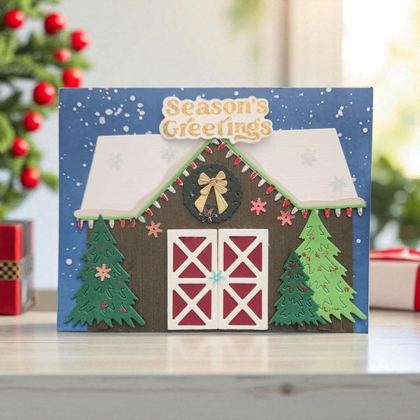 Country Christmas Barn Etched Dies are from the Country Christmas Collection by Annie Williams. Build a barn with this set of 17 thin metal cutting dies! Includes everything to dress it up for the holidays too: wreath, two sizes of trees, and holiday lights! After the holidays, take the décor off or make another one for all year round!