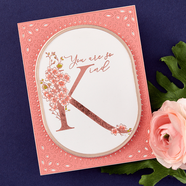 BetterPress Floral Alphabet on its own or use with the sentiment. Center the letter and sentiment on an A2-size (4.25 x 5.5-inch) card base for a lovely focal point design. Refer to images for placement recommendation.